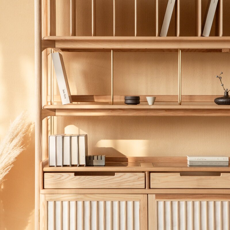 告别款 客厅落地防尘实木书柜带门侘寂风组合展示柜 悠日书柜