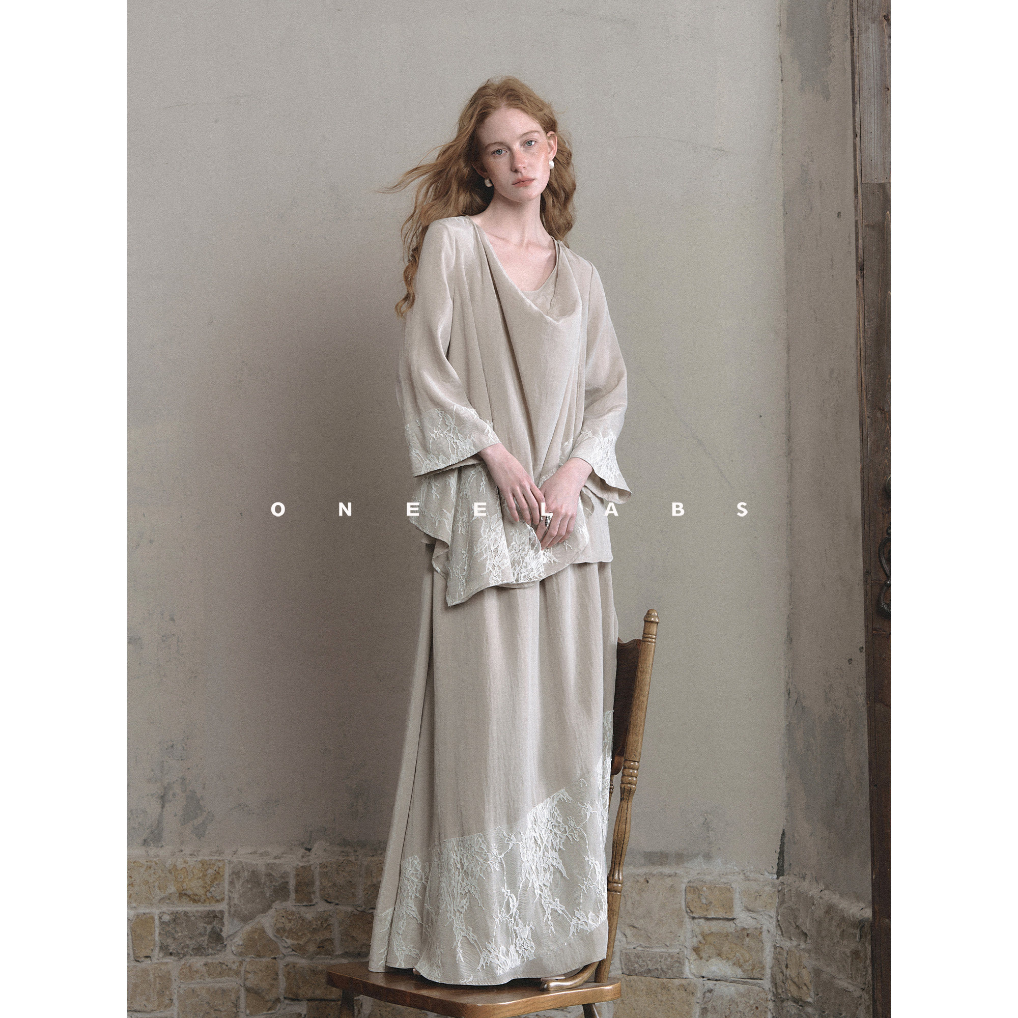 ONEELABS原创品牌 天丝荡领上衣 A字半身裙套装 镂空蕾丝绣花拼接