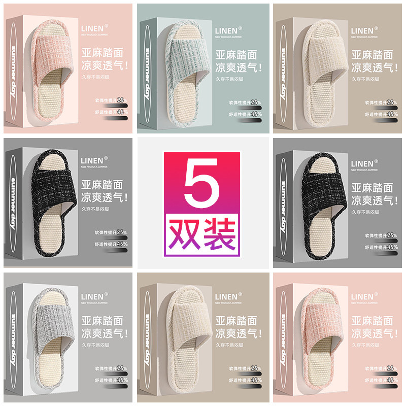 女室内家居防滑防臭静音吸汗棉麻拖鞋 家用招待客人亚麻拖鞋 5双装