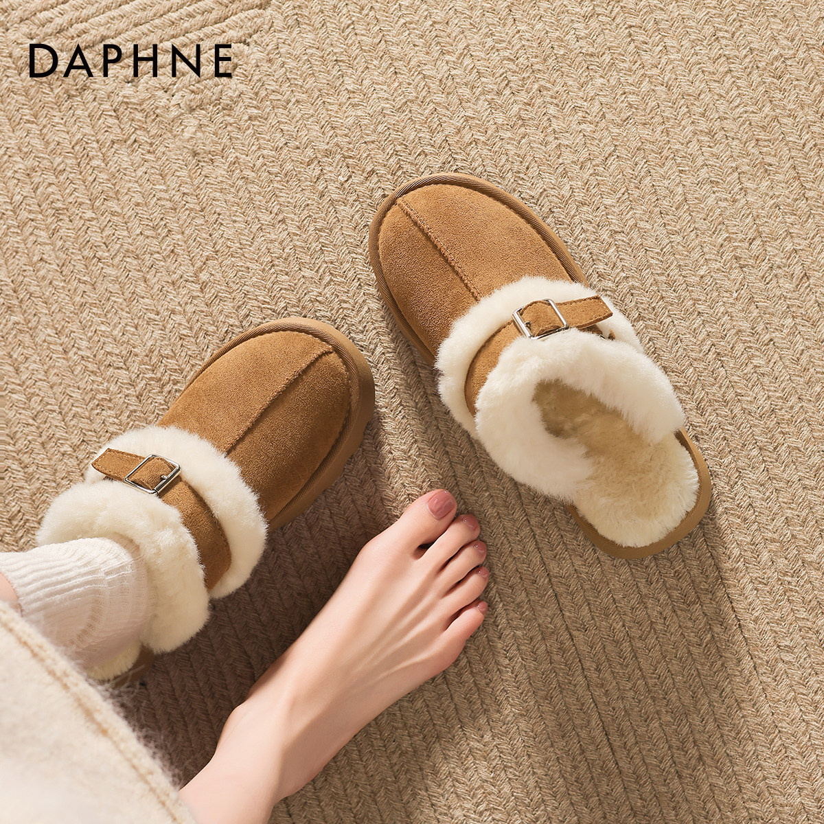 为您提供商品保暖外穿棉拖鞋 达芙妮半拖雪地靴女款 2026新款 冬季 加绒勃肯毛毛鞋的详细介绍,