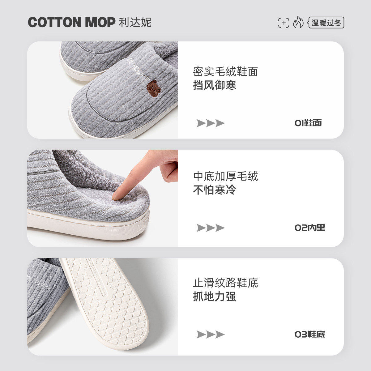 为您提供商品利达妮男士 抗菌2026新款 外穿厚底防滑家居加绒保暖毛拖女款 棉拖鞋的详细介绍,