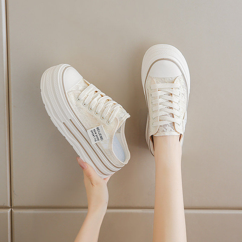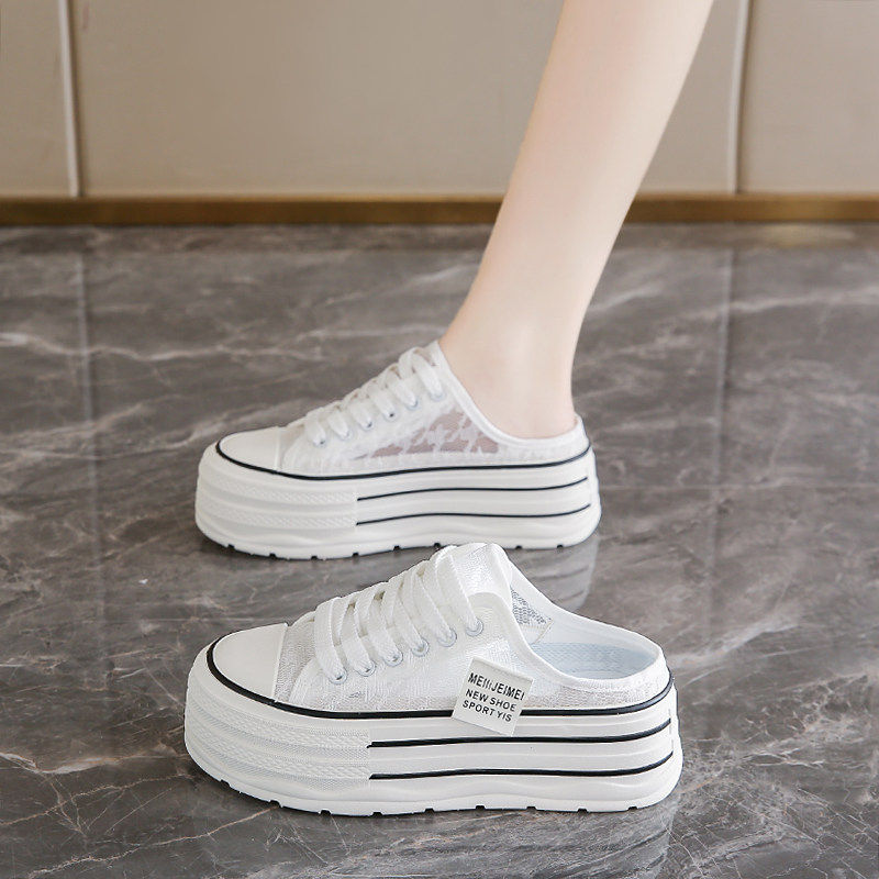 透气网面蕾丝小白鞋 半拖帆布鞋 女2026夏季 新款 配裙子增高厚底板鞋