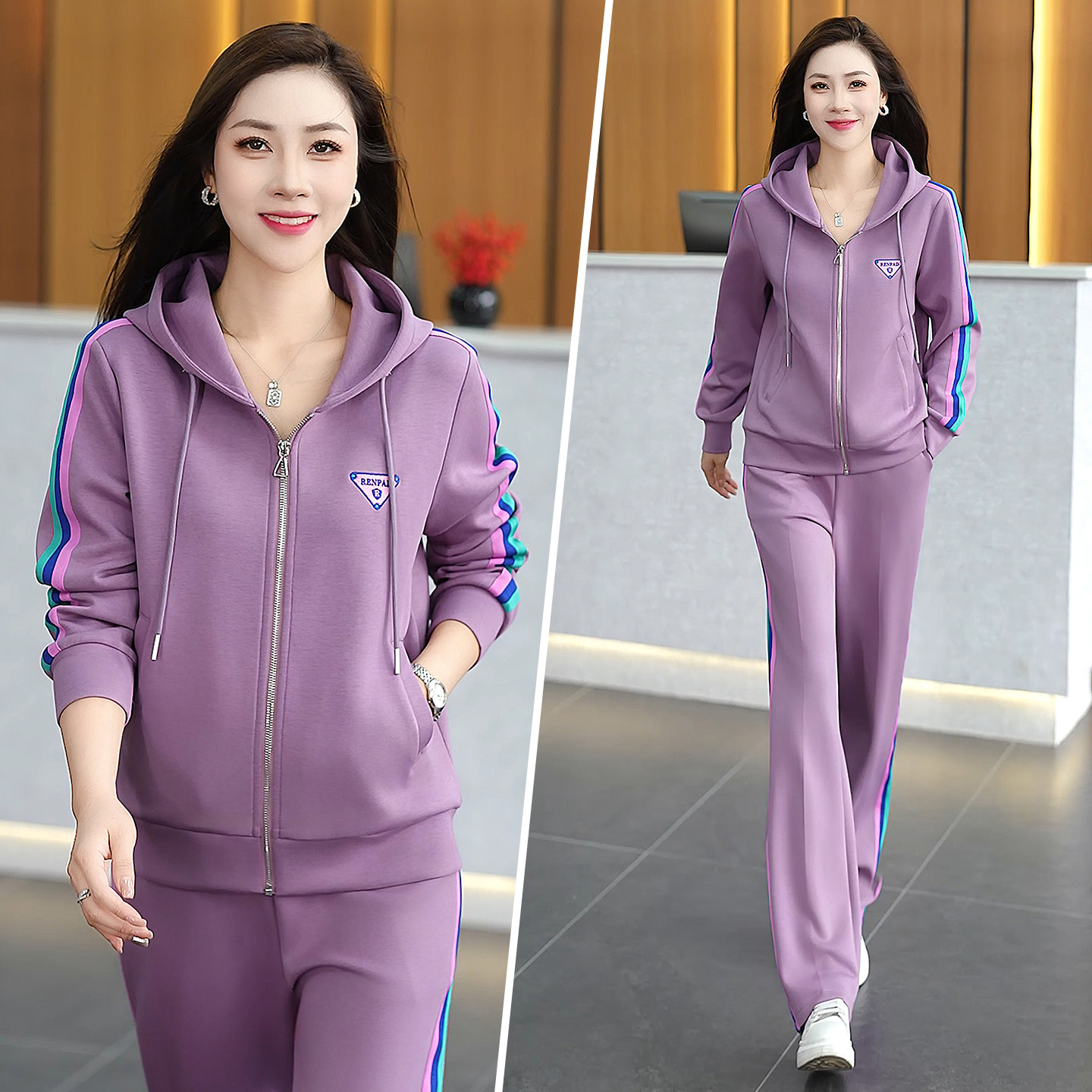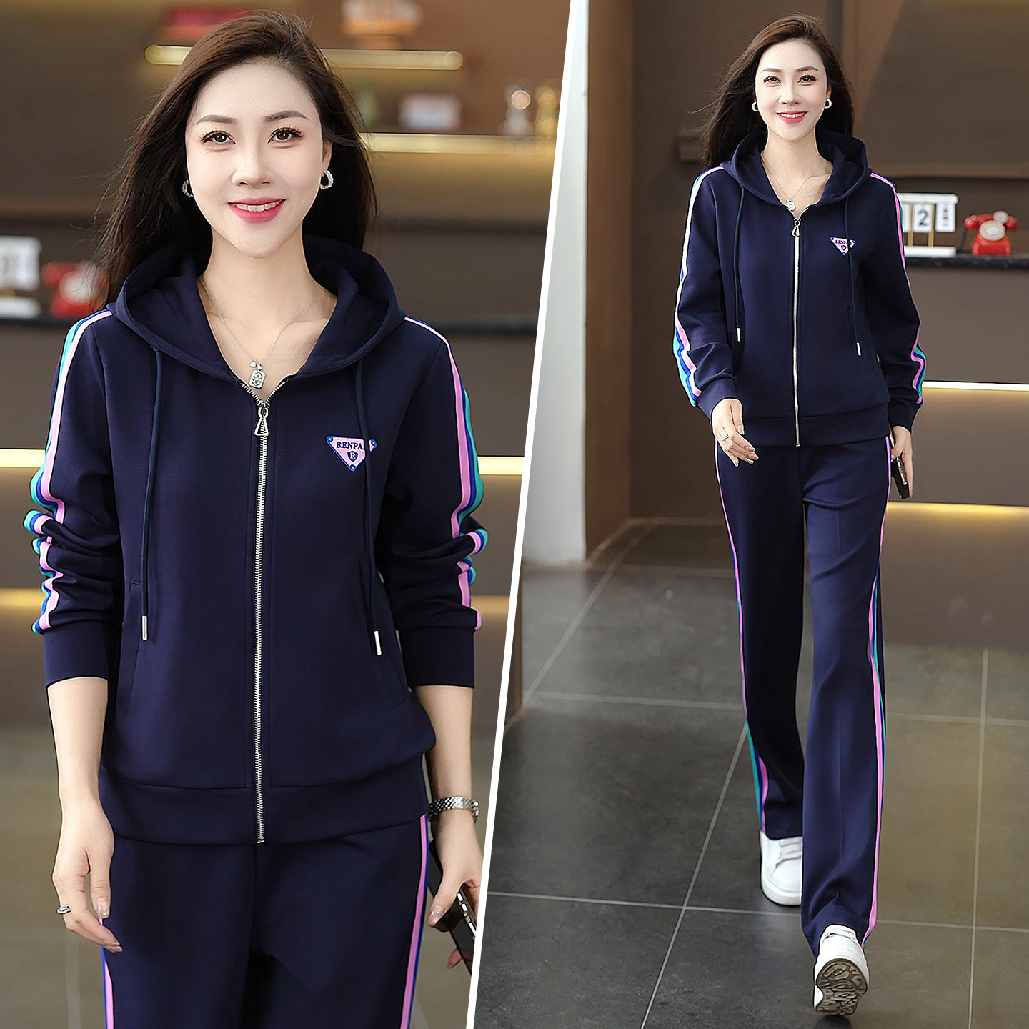 为您提供商品女2026春秋连帽拉链显瘦洋气减龄长袖 撞色两件套 休闲运动套装 时尚的详细介绍,