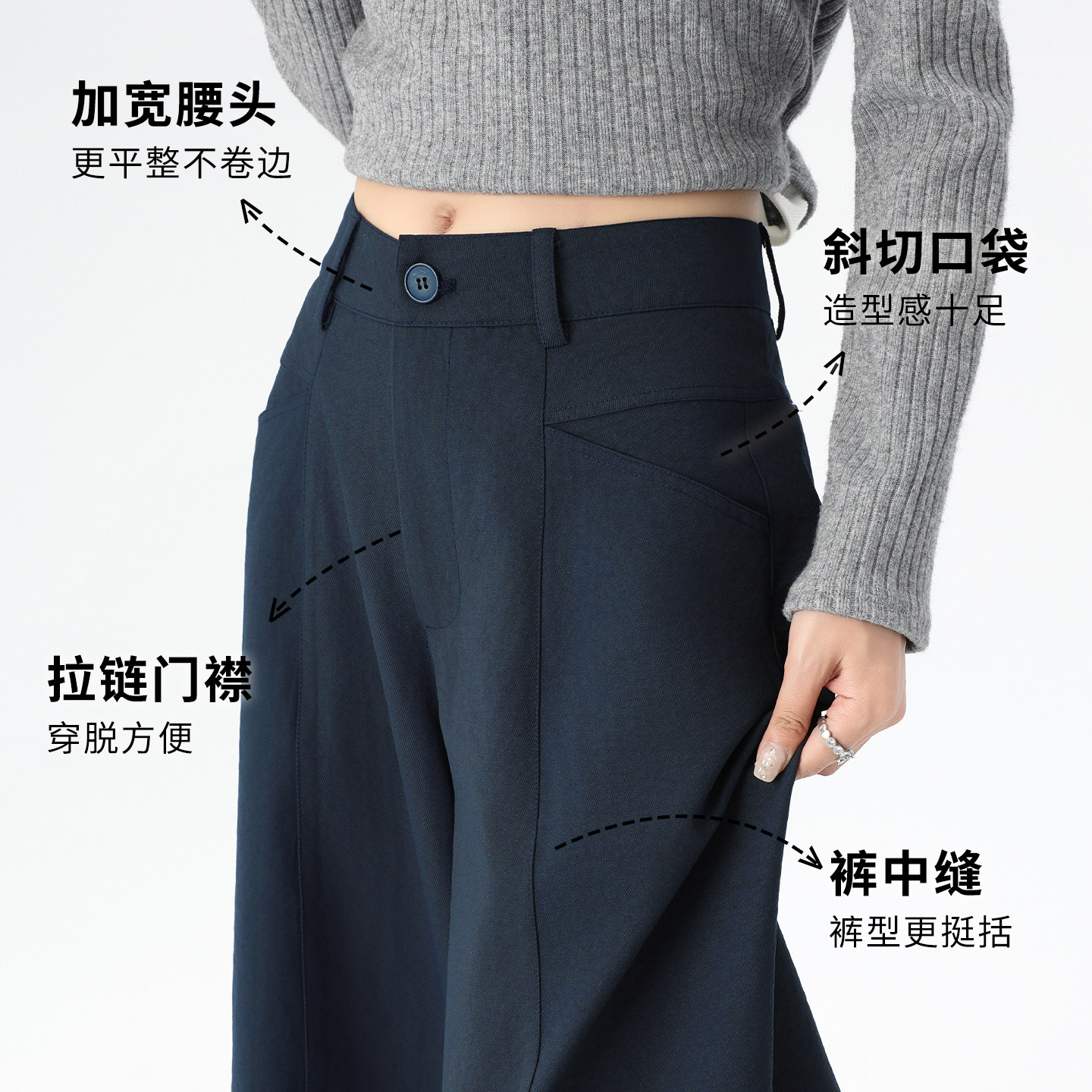 为您提供商品阔腿裤 藏青色弯刀裤 设计感西装 垂感宽松休闲直筒裤 女26年春季 新款的详细介绍,