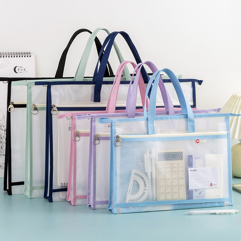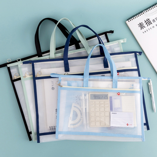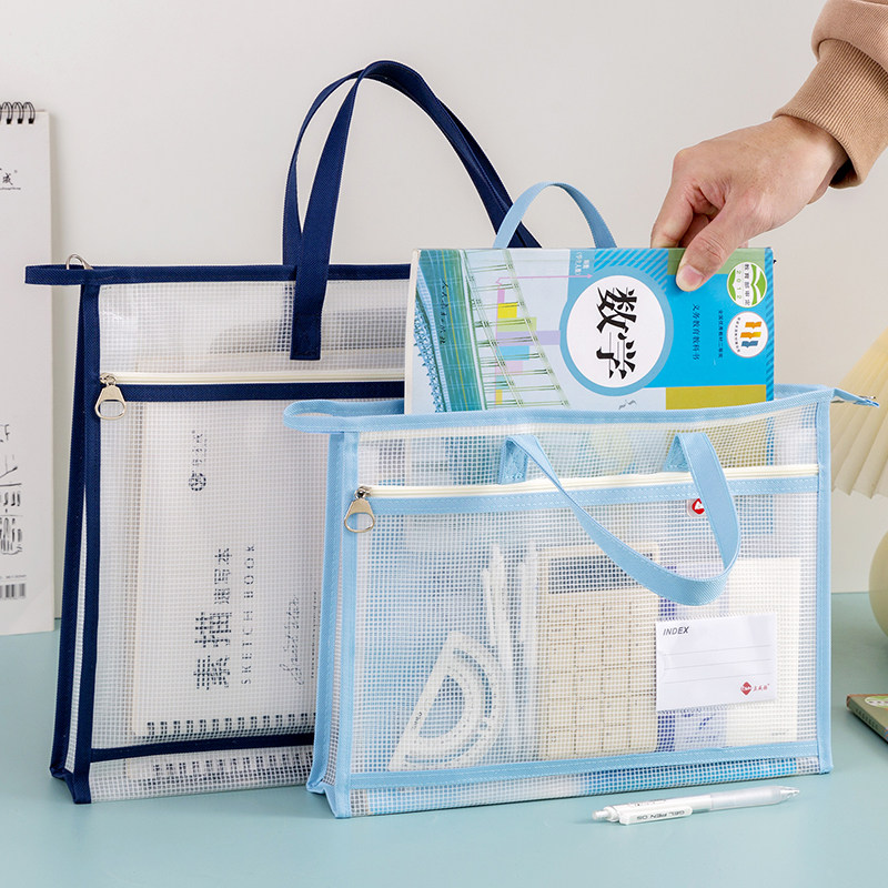 小学生初中生专用手提书袋高中生试卷资料书本作业袋子档案科目分类袋 双层大容量A4透明网纱文件收纳袋拉链式