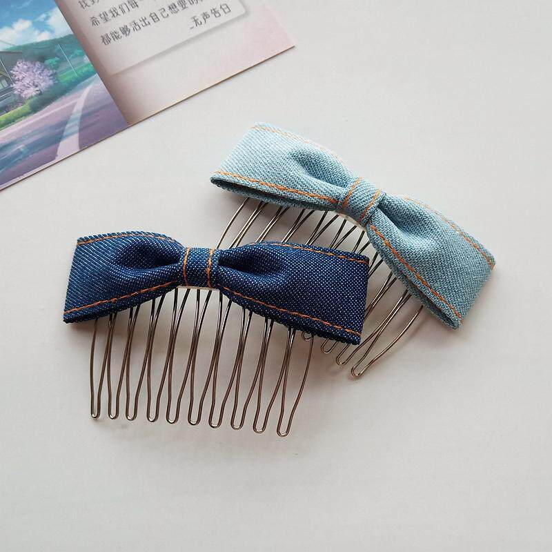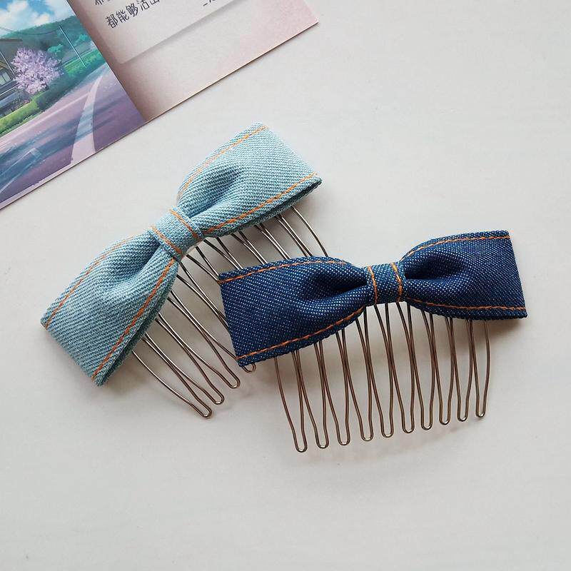 牛仔布艺蝴蝶结十齿发梳成人刘海插梳少女甜美发叉简约盘发卡职业