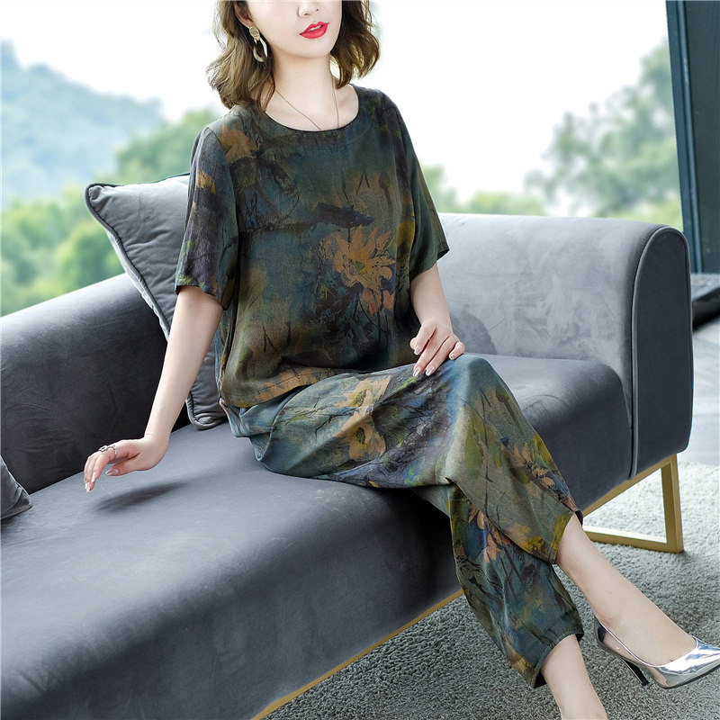 夏季 中老年妈妈装 桑蚕丝民族风套装 两件套香云纱宽松遮肚真丝大码