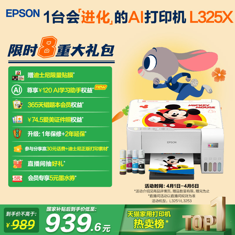 爱普生L3251 L3253迪士尼系列墨仓式 打印机彩色无线WIFI复印扫描照片学生作业家用小型 政府补贴