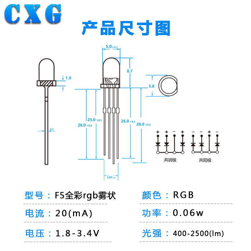 为您提供商品RGB四脚七彩共阴共阳 红蓝绿光 5mm圆头直插全彩透明雾状灯珠的详细介绍,