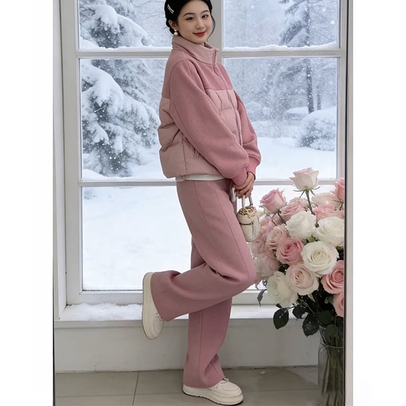 2026秋冬季 洋气毛呢休闲运动套装 女拼接羽绒外套阔腿裤 两件套 新款由