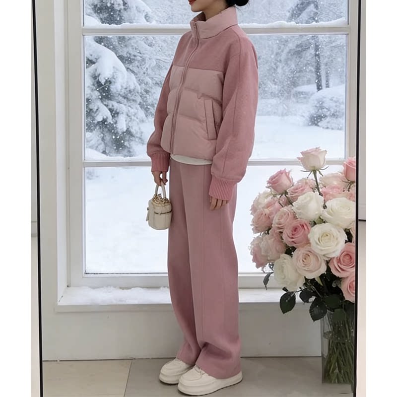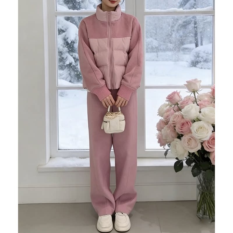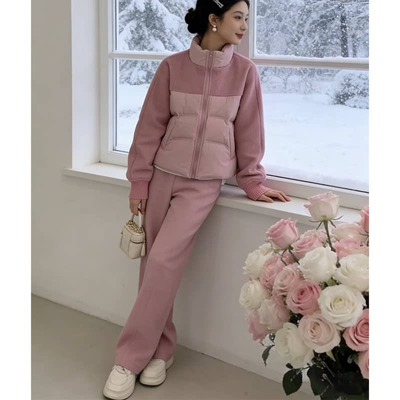2026秋冬季 洋气毛呢休闲运动套装 女拼接羽绒外套阔腿裤 两件套 新款