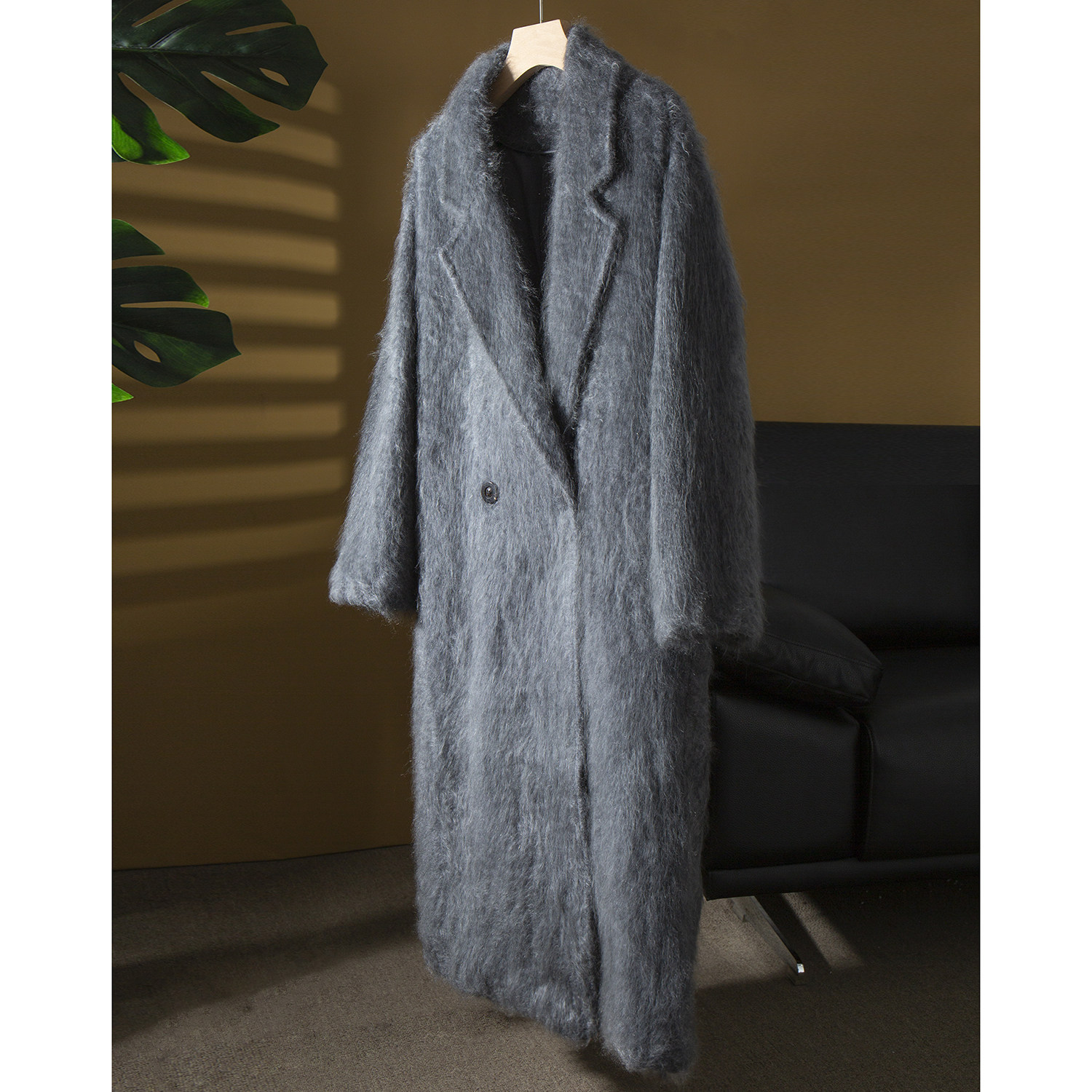 亏清 廓形毛呢外套 100%纯山羊绒拉绒拉毛皮草大衣女双排扣中长款由