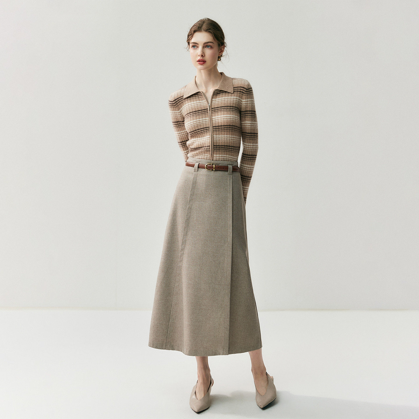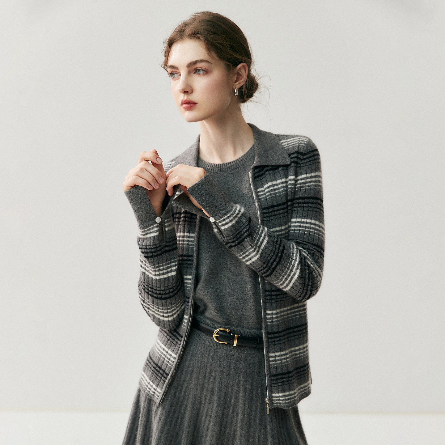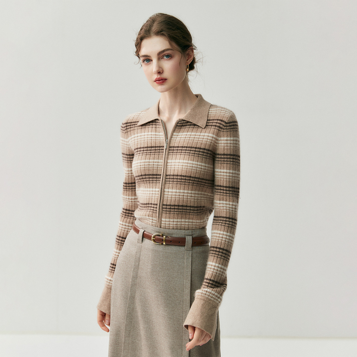 女polo领毛衣紧身显瘦外套 条纹拼色气质bab羊山羊绒针织开衫由
