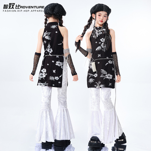 女童jazz穿搭走秀女团街舞黑色旗袍长裙舞蹈演出服 儿童爵士舞套装