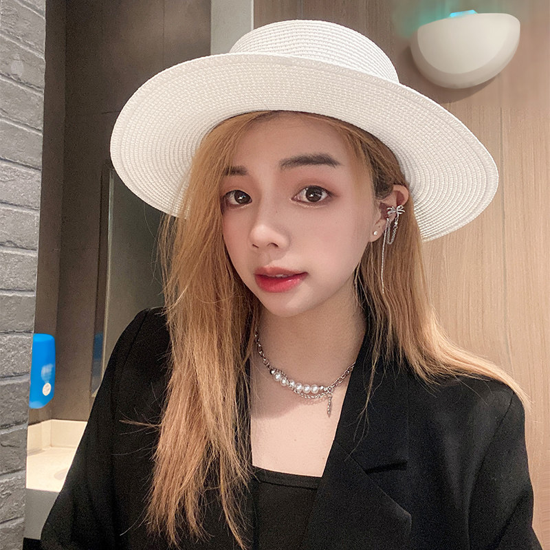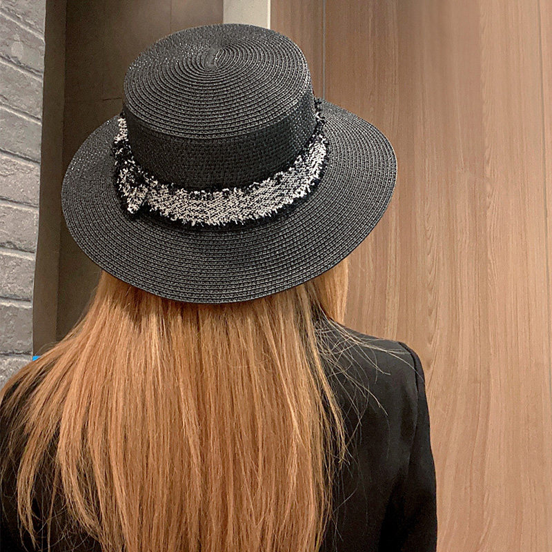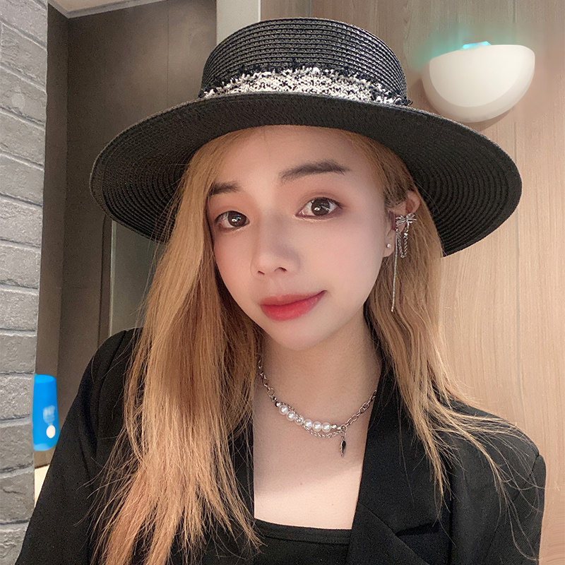 法式 新款 海边沙滩帽子百搭时尚 水钻平顶礼帽防晒遮阳帽 草帽女夏季
