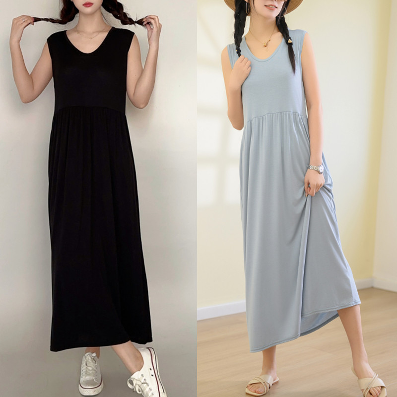 春夏薄款 莫代尔长裙宽松直筒裙背心打底裙外穿过膝拼接连衣裙大码由