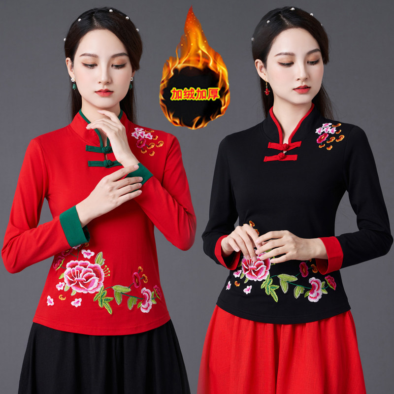 为您提供商品民族风女装 中国风绣花长袖 t恤复古立领刺绣加绒打底衫 女 上衣新款的详细介绍,
