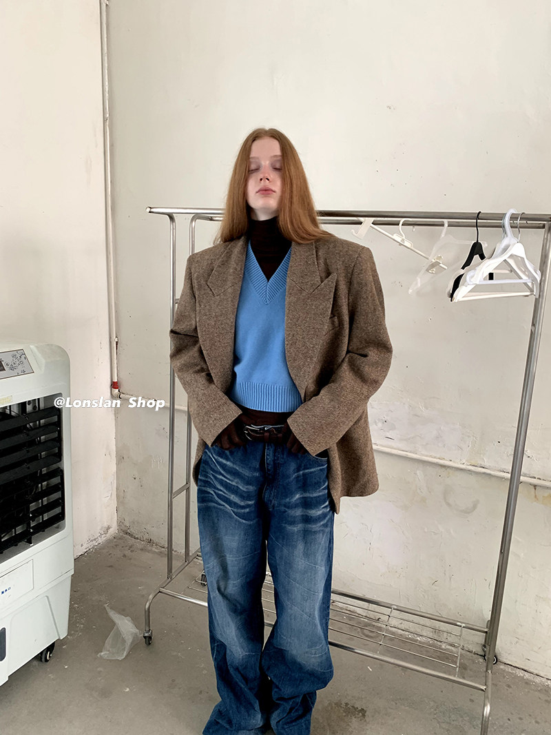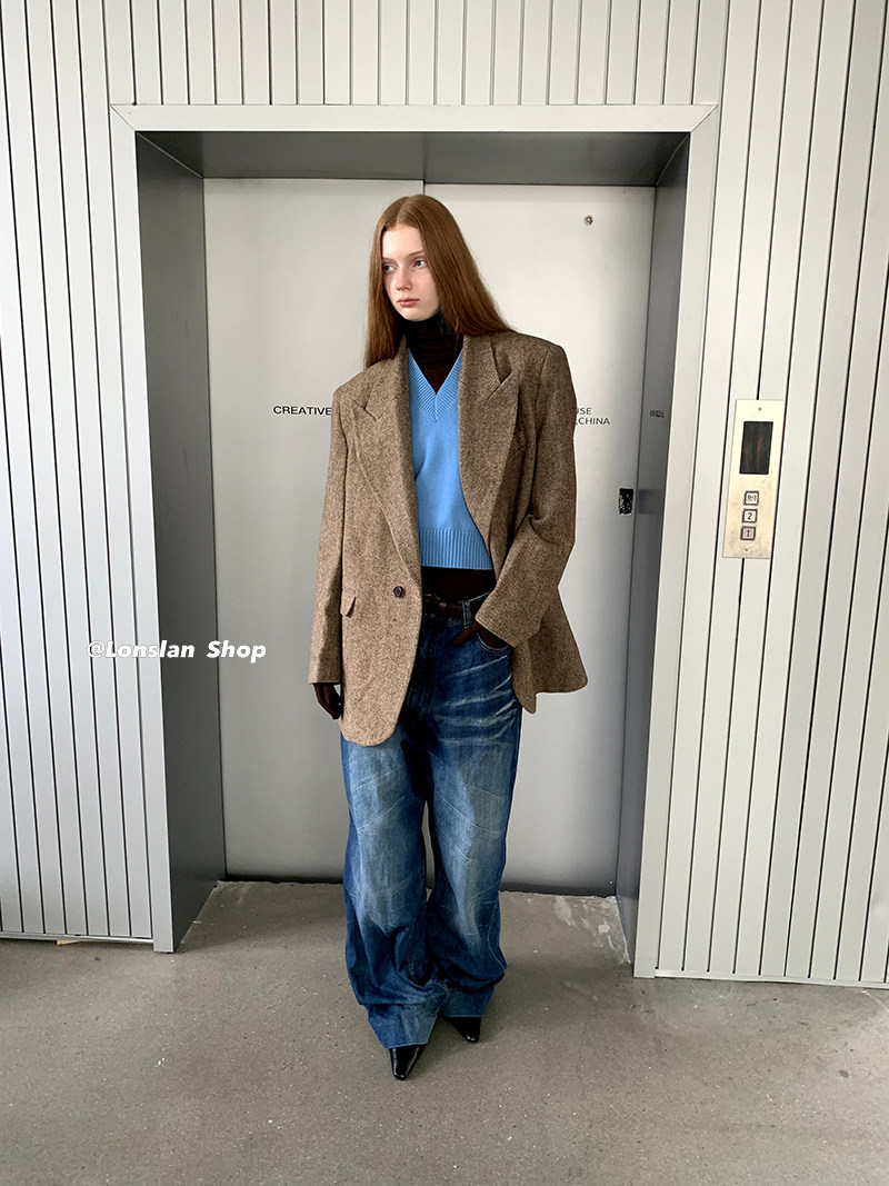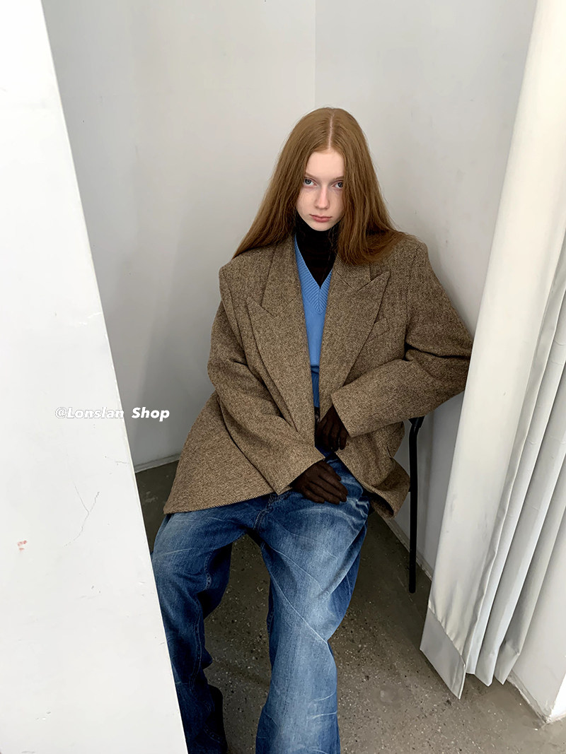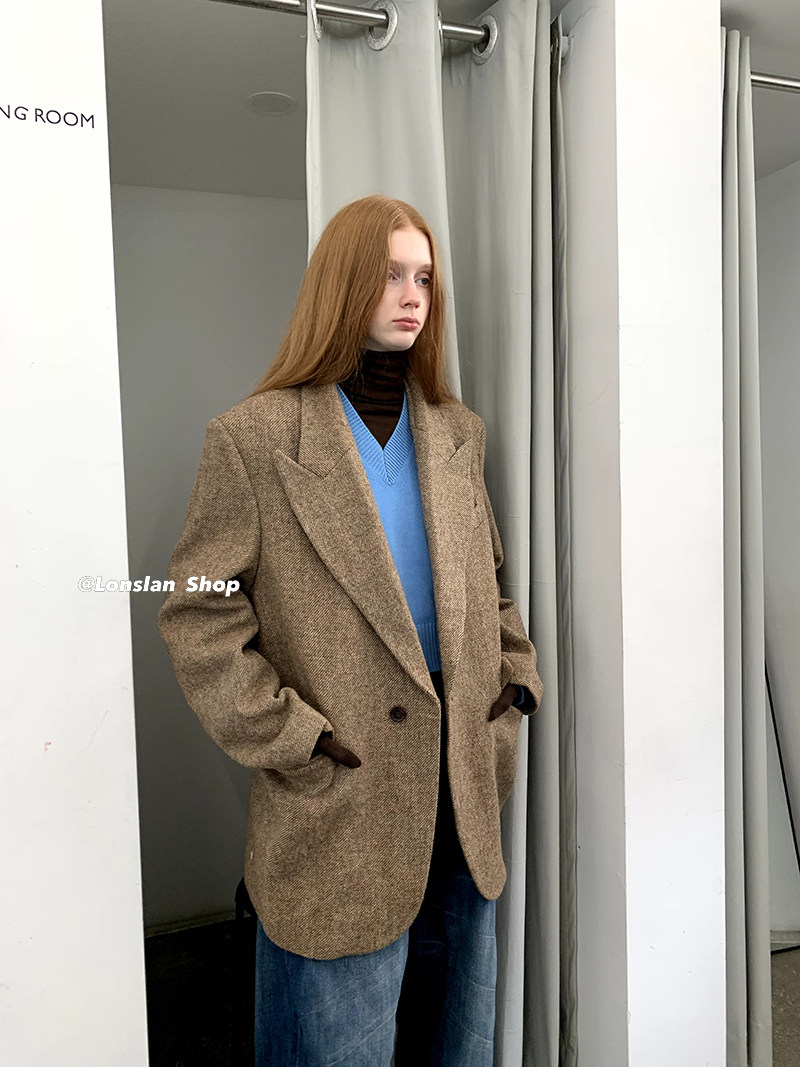 LONSLAN 宽松百搭卡其色重工羊毛西装 开衫 外套上衣女 2023秋冬新款