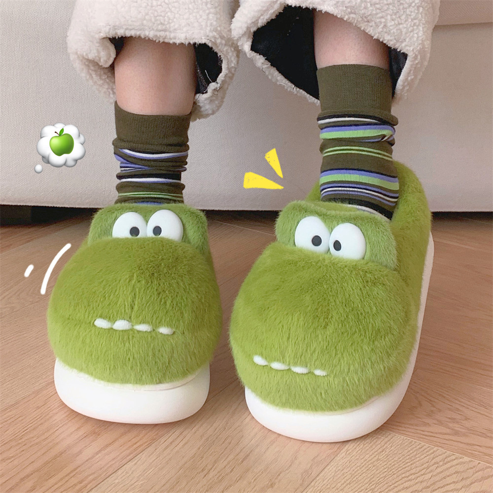 男女冬季 防滑保暖毛绒软底月子鞋 细细条卡通可爱恐龙亲子棉拖鞋