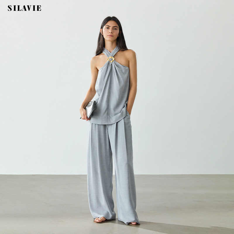 SILAVIE独家定制棉羊毛交叉挂脖背心阔腿西裤 套装 高圆圆同款由