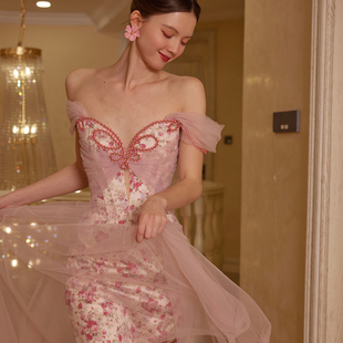 LaceMade 法式 仙女裙纱网缎面印花鱼骨连衣裙新品 礼服裙 花漾蝶仙由
