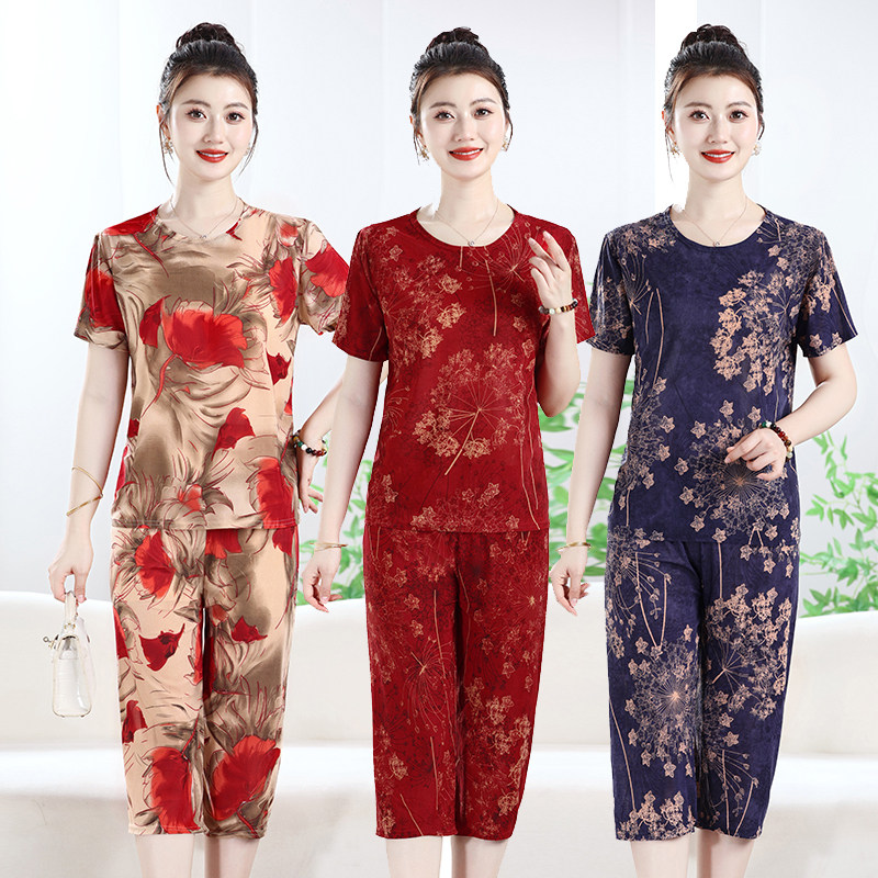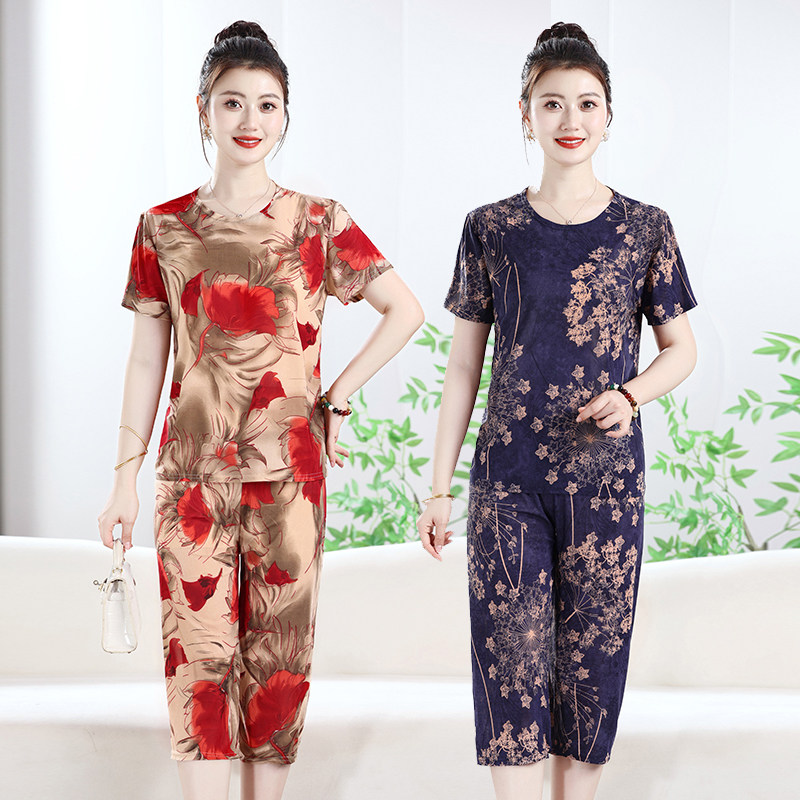 大码 新款 冰丝套装 宽松两件套女 洋气短袖 T恤休闲七分裤 女装 妈妈装由