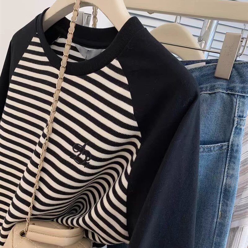 为您提供商品t恤女长袖 春秋宽松显瘦设计感小众胖mm上衣 300斤条纹插肩袖 特大码的详细介绍,