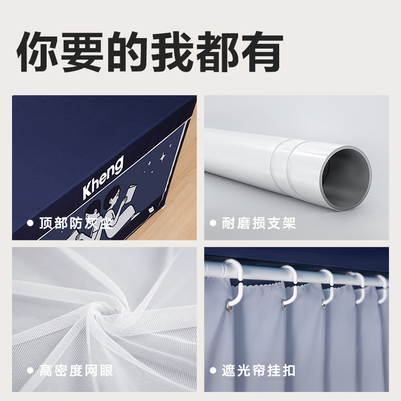 为您提供商品寝室强遮光帘子上铺上下铺通用带支架 康亨学生宿舍床帘蚊帐一体式的详细介绍,
