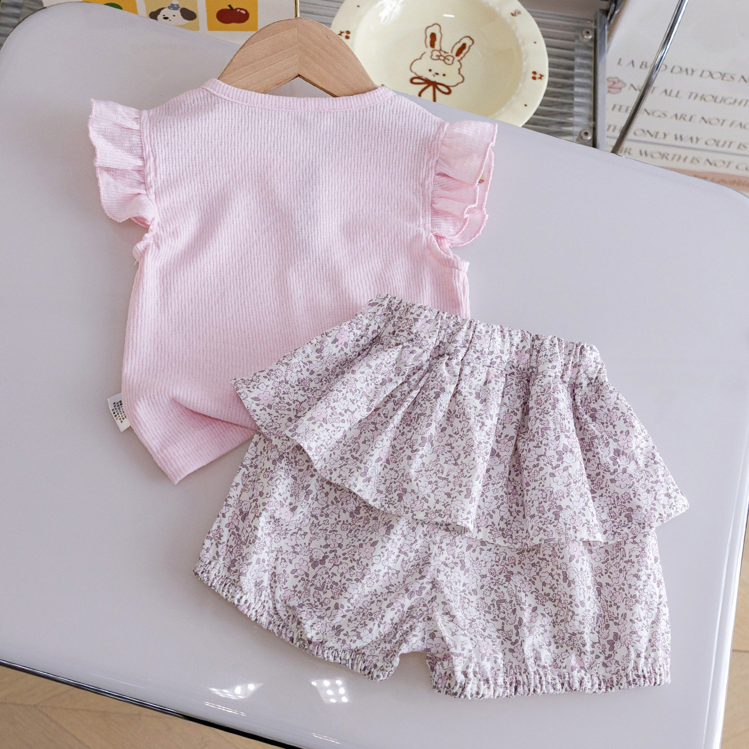 背心T恤洋气碎花花苞短裤 女童时髦韩版 两件套3 飞袖 夏季 套装 26新款