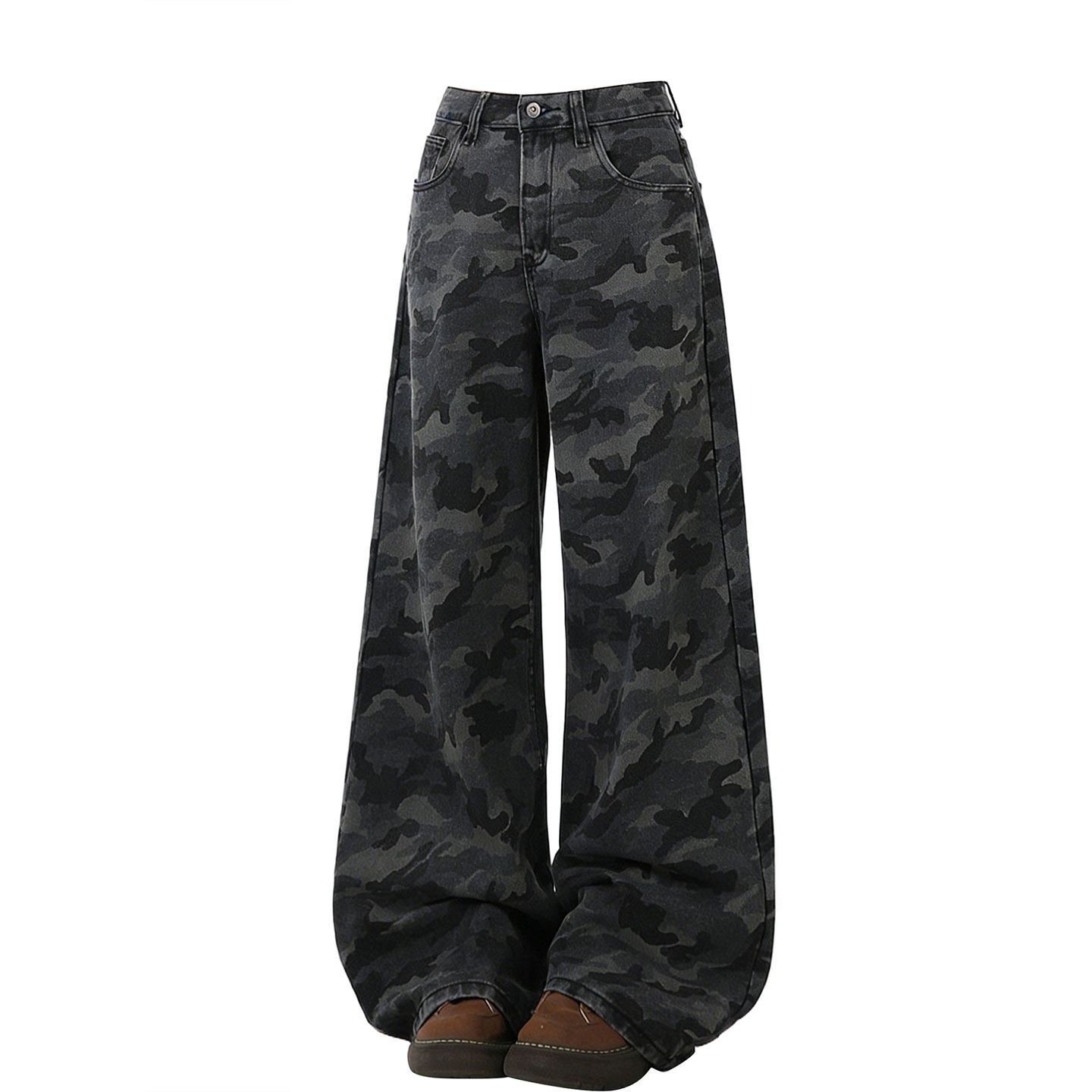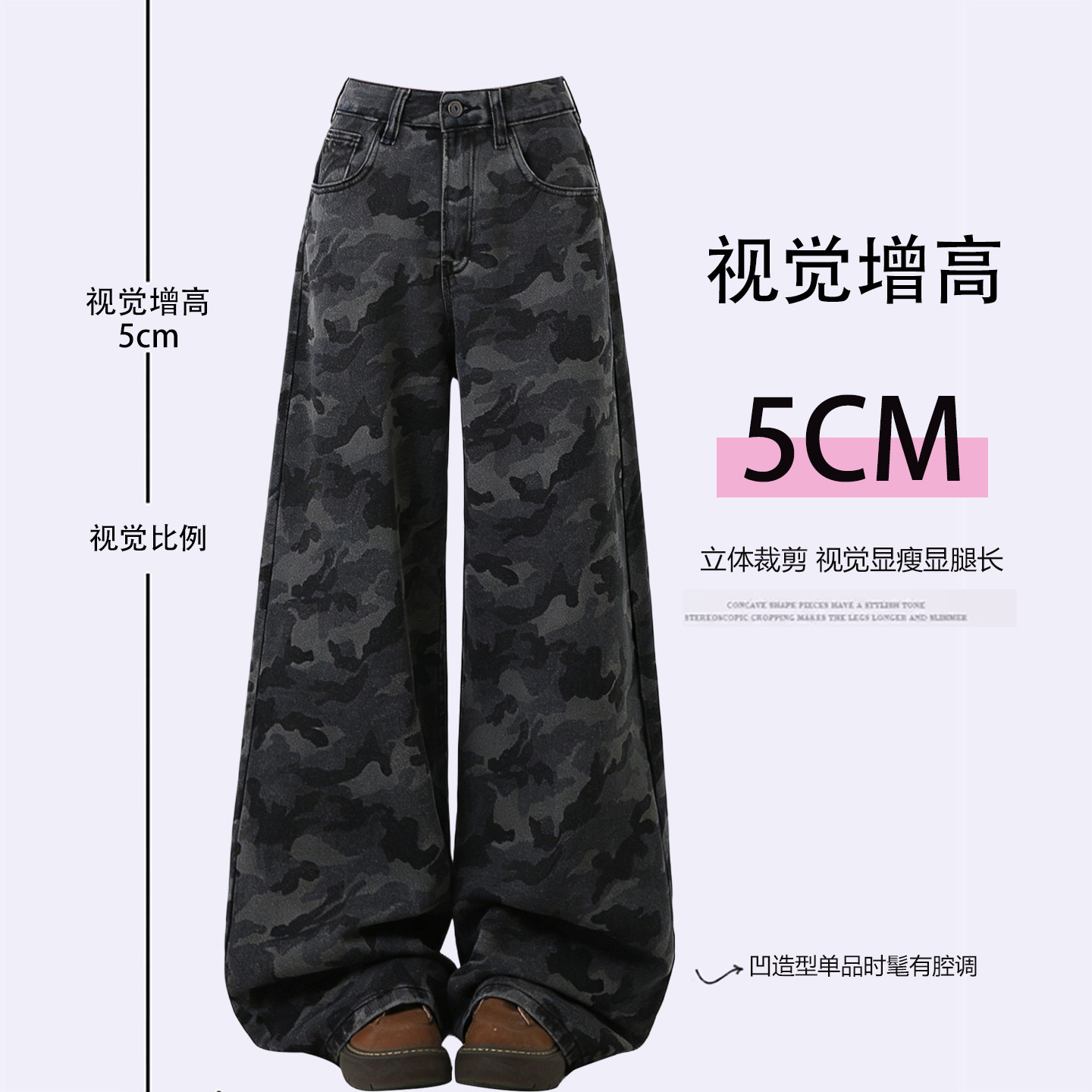迷彩阔腿牛仔裤 300斤特大码 女装 美式 子 女辣妹风减龄韩系chic感裤