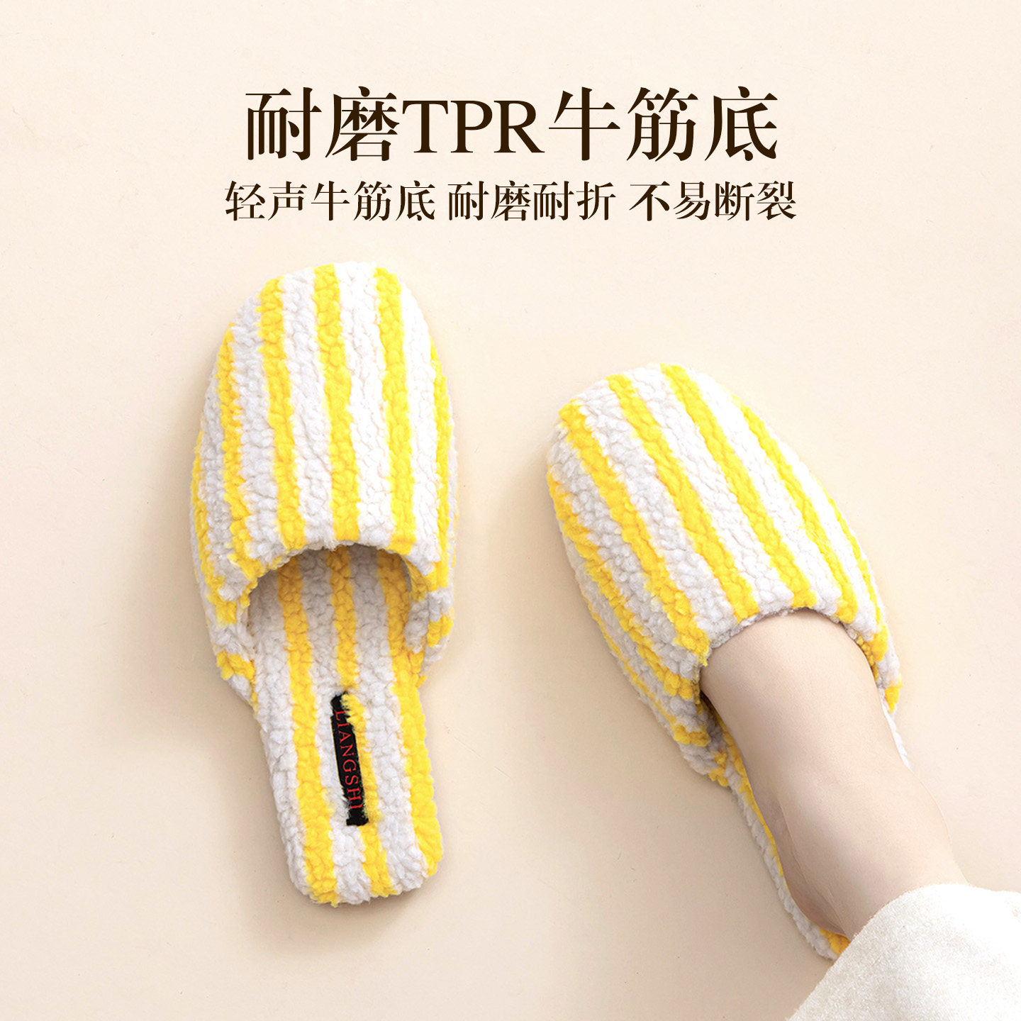 日系多巴胺撞色条纹复古保暖室内居家毛绒情侣防滑拖鞋 棉拖鞋 冬季