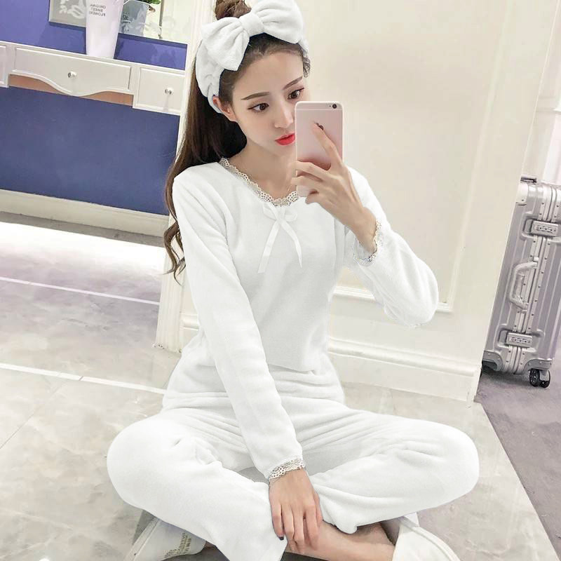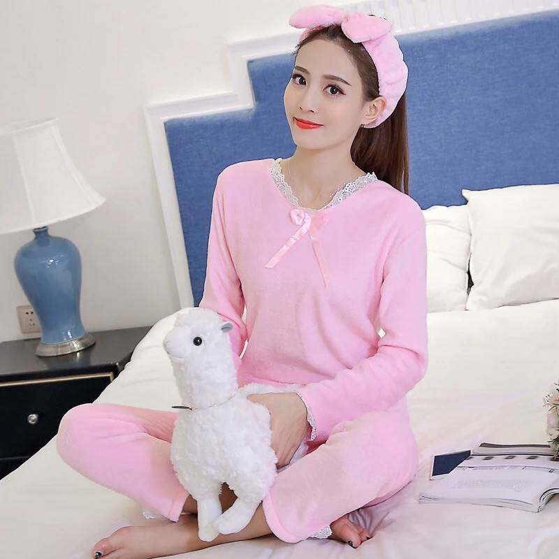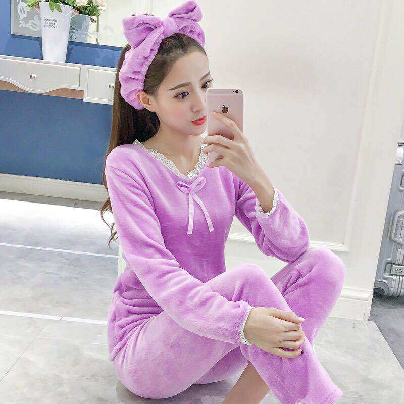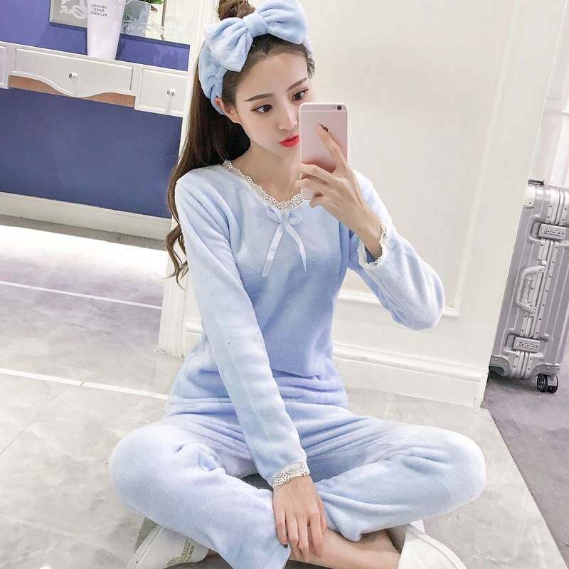 睡衣女秋冬款 加厚保暖珊瑚绒蕾丝花边公主风法兰绒送发带灰色套装