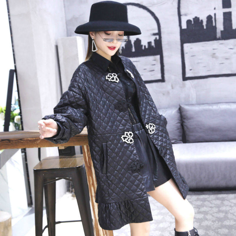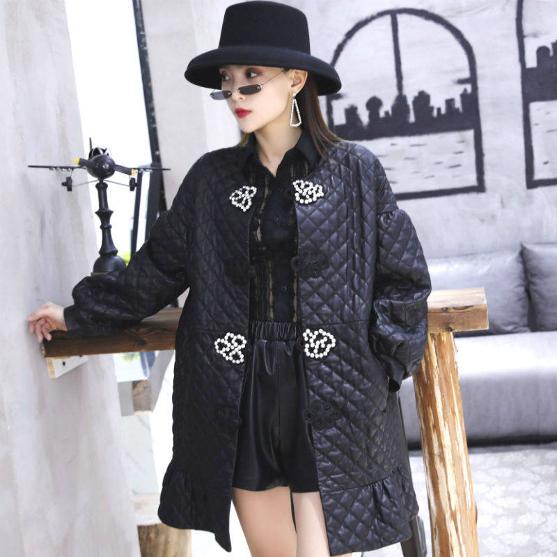 皮衣女中长款 绵羊皮韩版 皮夹克真皮加棉灯笼袖 风衣外套 2025秋新款