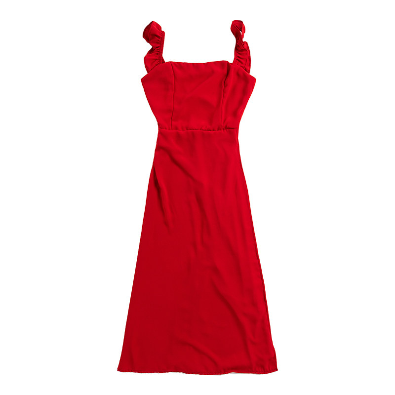 为您提供商品性感露腰背带开叉木耳边吊带沙滩裙长裙 大红色连衣裙女夏2023新款的详细介绍,