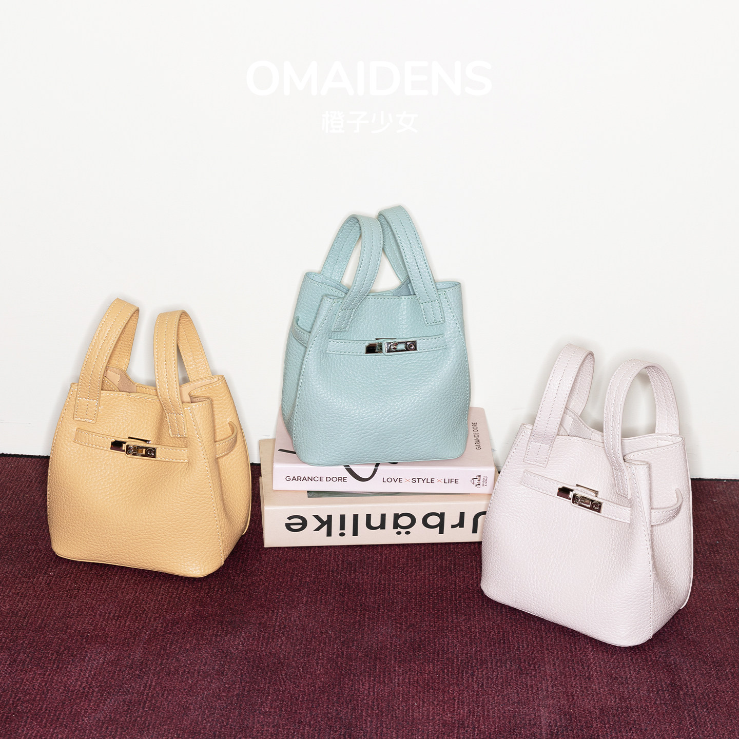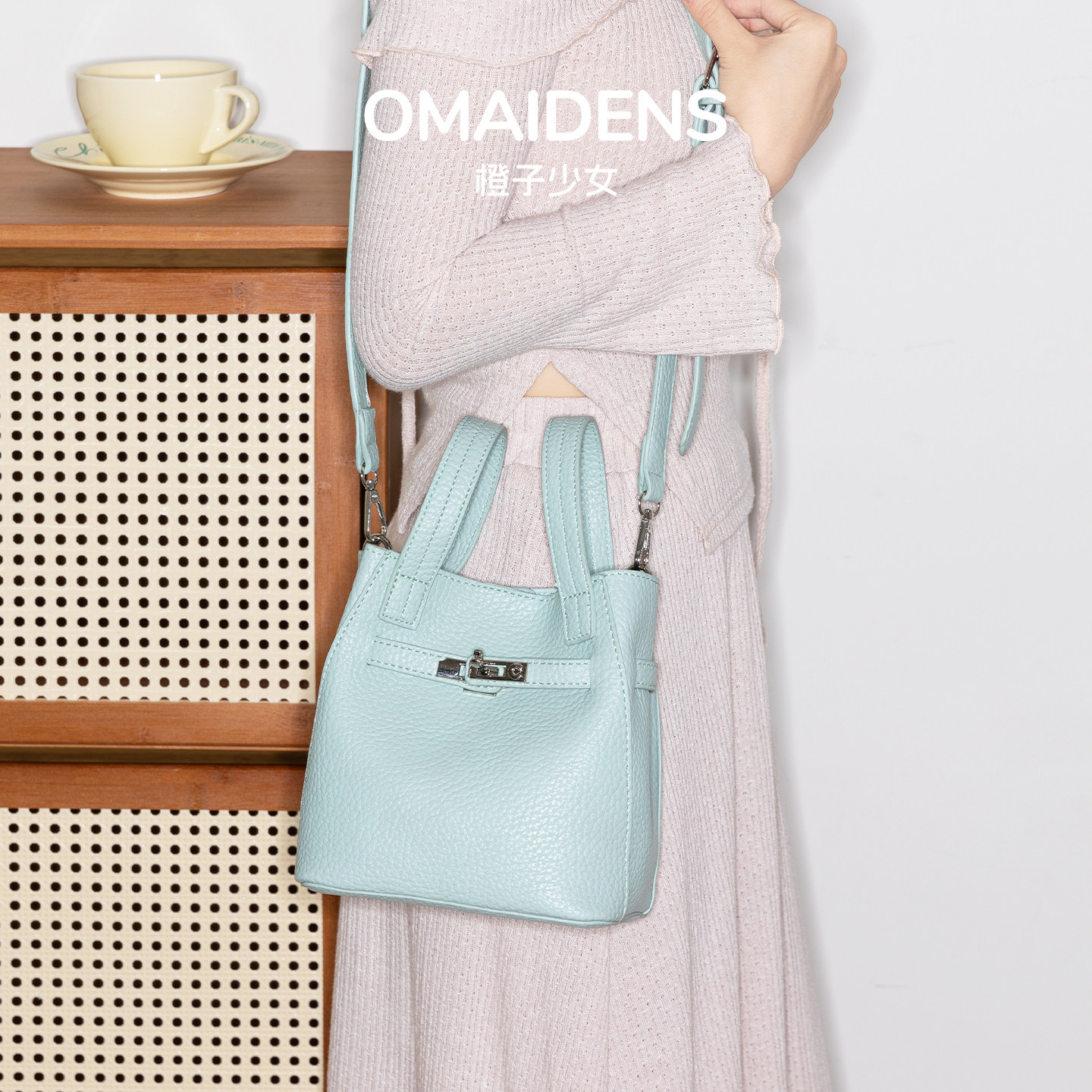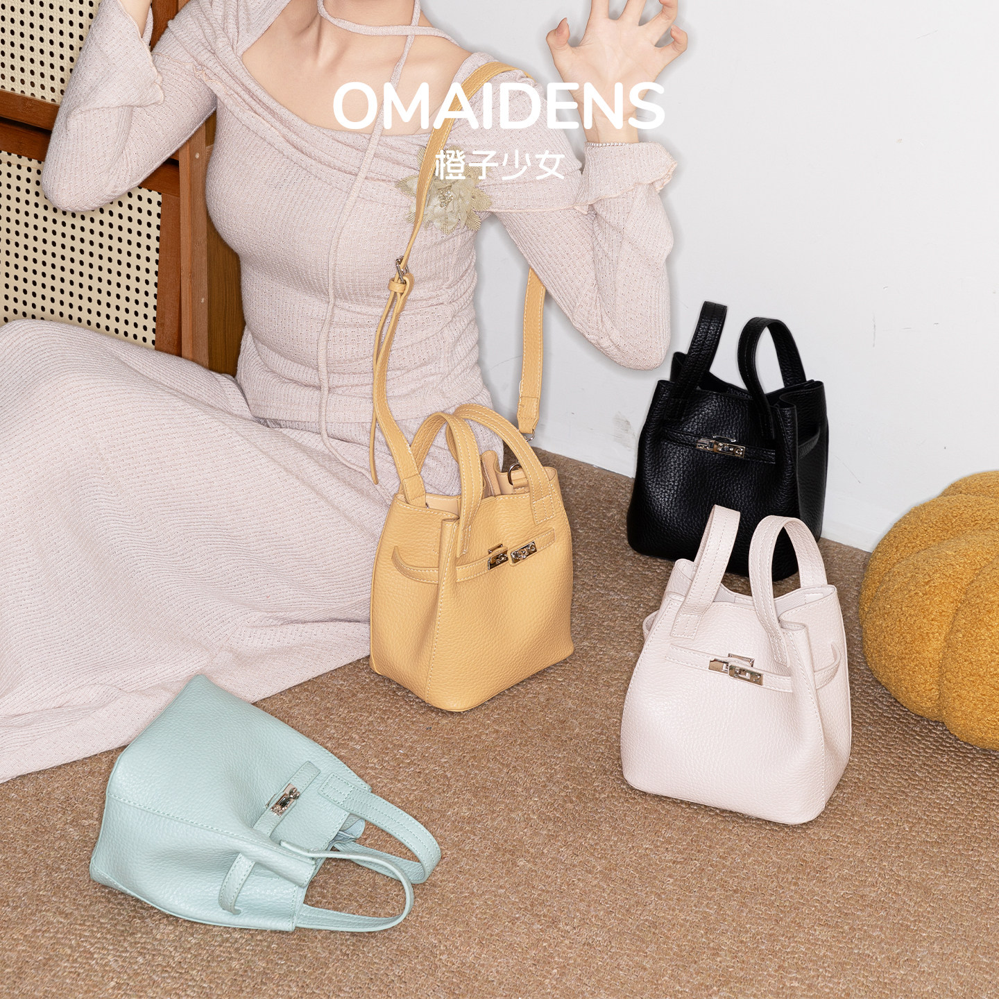 大容量通勤单肩斜挎小包 橙子少女荔枝纹菜篮子手提包水桶包女新款