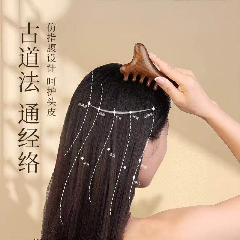 头皮按摩梳子脱发头部经络梳防眼部面部刮痧五齿按摩器五指檀木梳