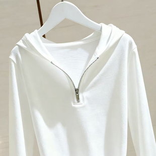 上衣百搭显瘦女装 T恤休闲拉链宽松韩版 十三行新连帽纯色正肩长袖