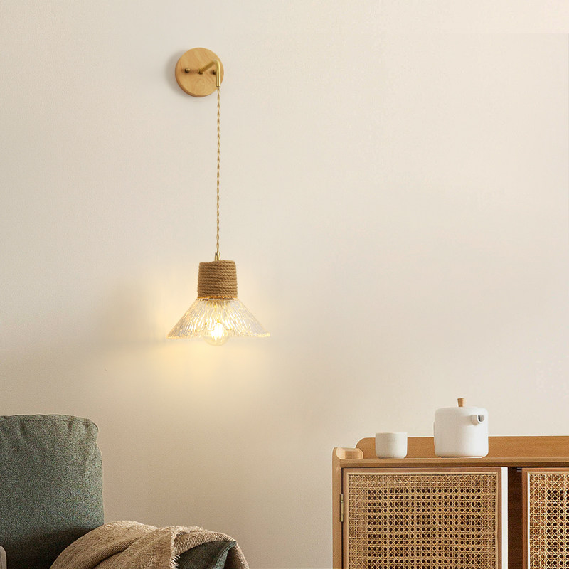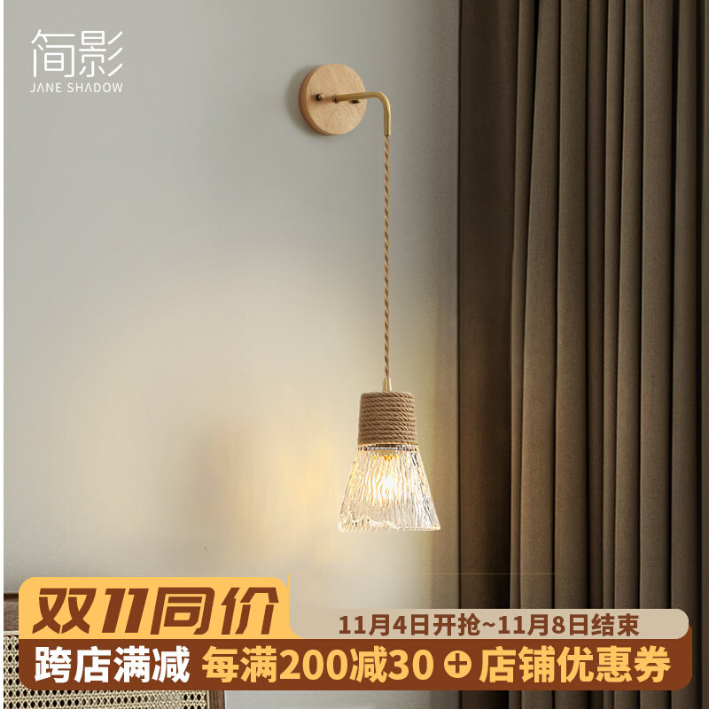 北欧简约日式 饰灯 侘寂实木玻璃卧室床头吊线壁灯客厅背景墙氛围装由