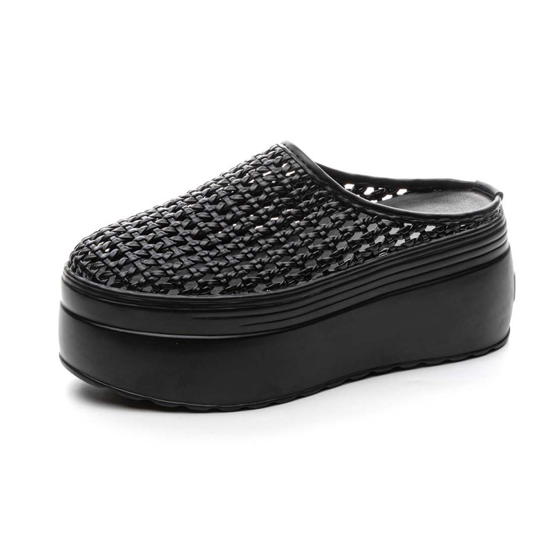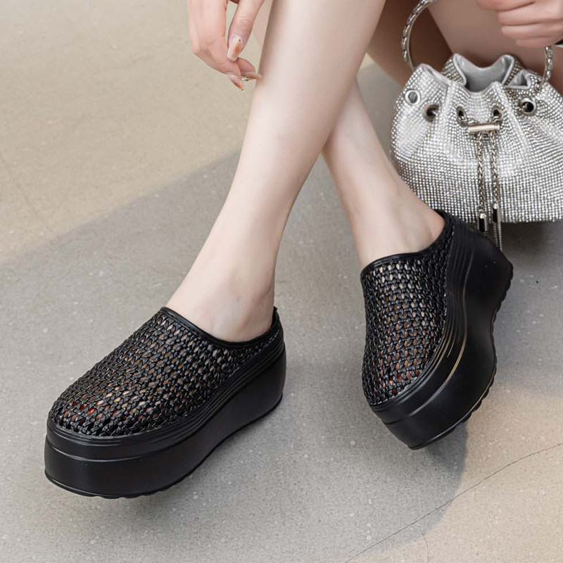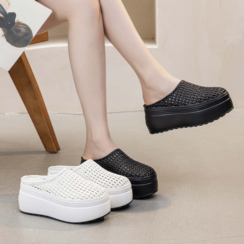 包头半拖鞋 百搭凉拖纯色 女藤草编镂空增高8cm夏外穿厚底透气时尚