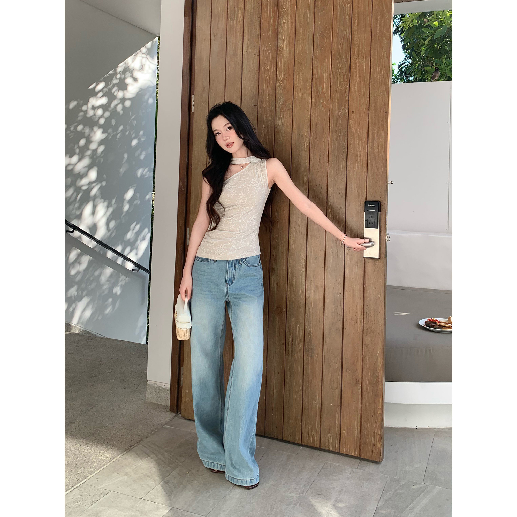 pusumede 斜纹低腰阔腿牛仔裤 女气质宽松无腰头直筒长裤 实穿主义