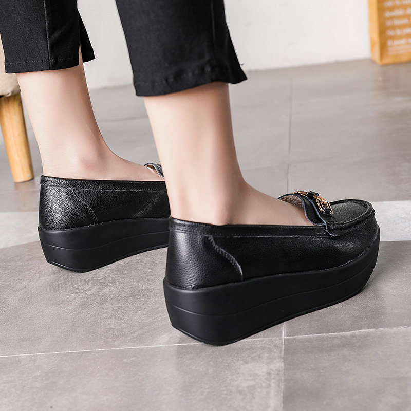 轻便软底女鞋 摇摇鞋 妈妈鞋 春秋季 女真皮厚底中年单鞋 一脚蹬松糕鞋