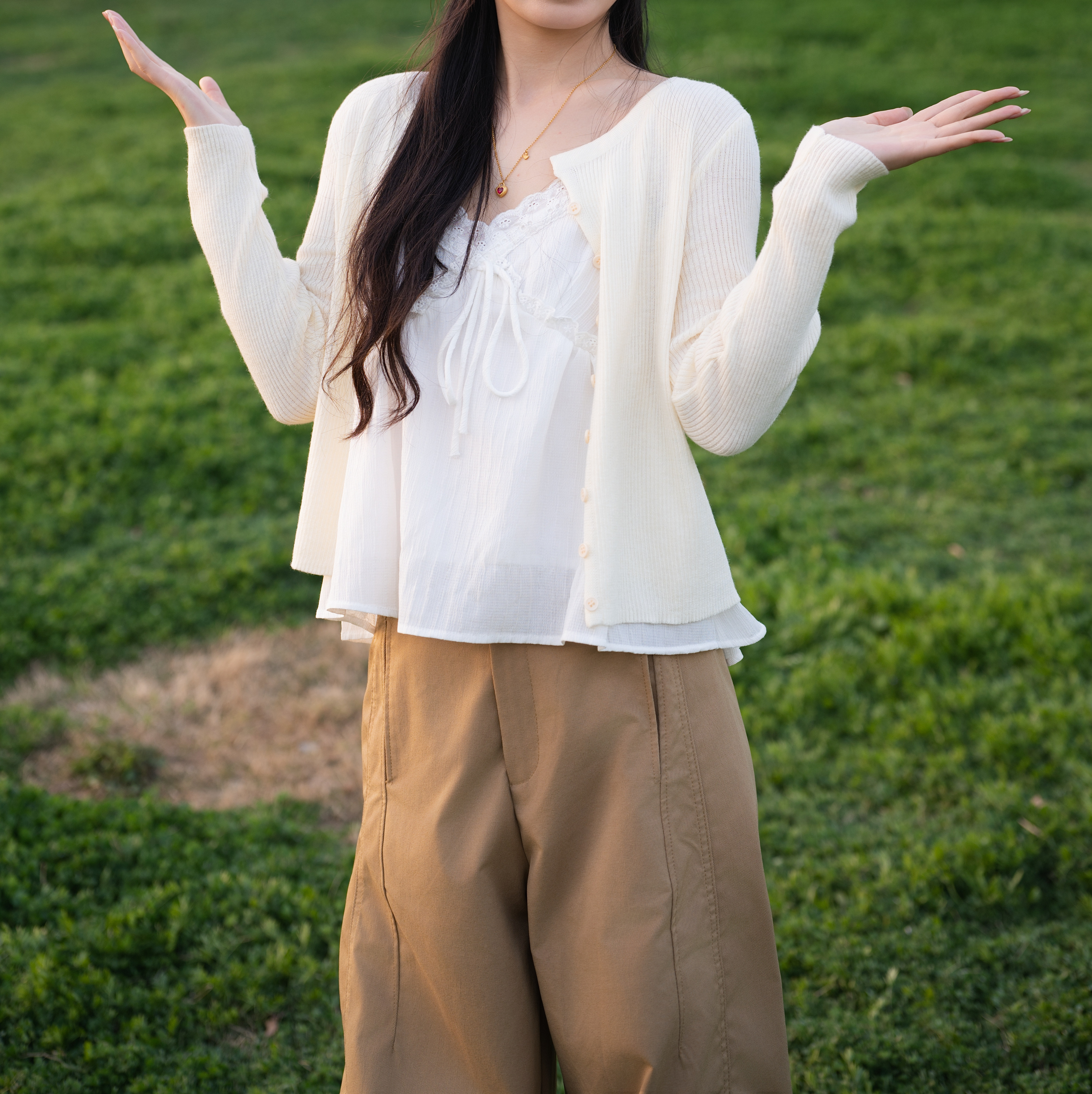 宽松阔腿卡其色裤 子2026春 上衣蕾丝边白色吊带背心 温柔感女春季