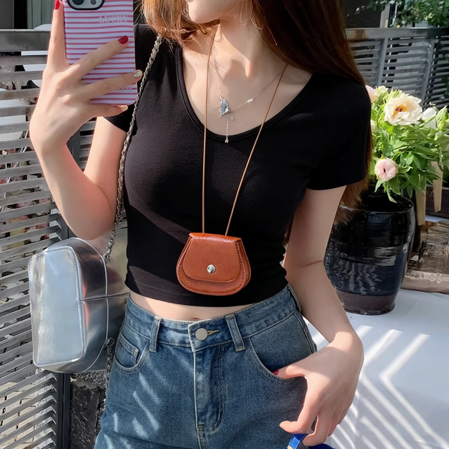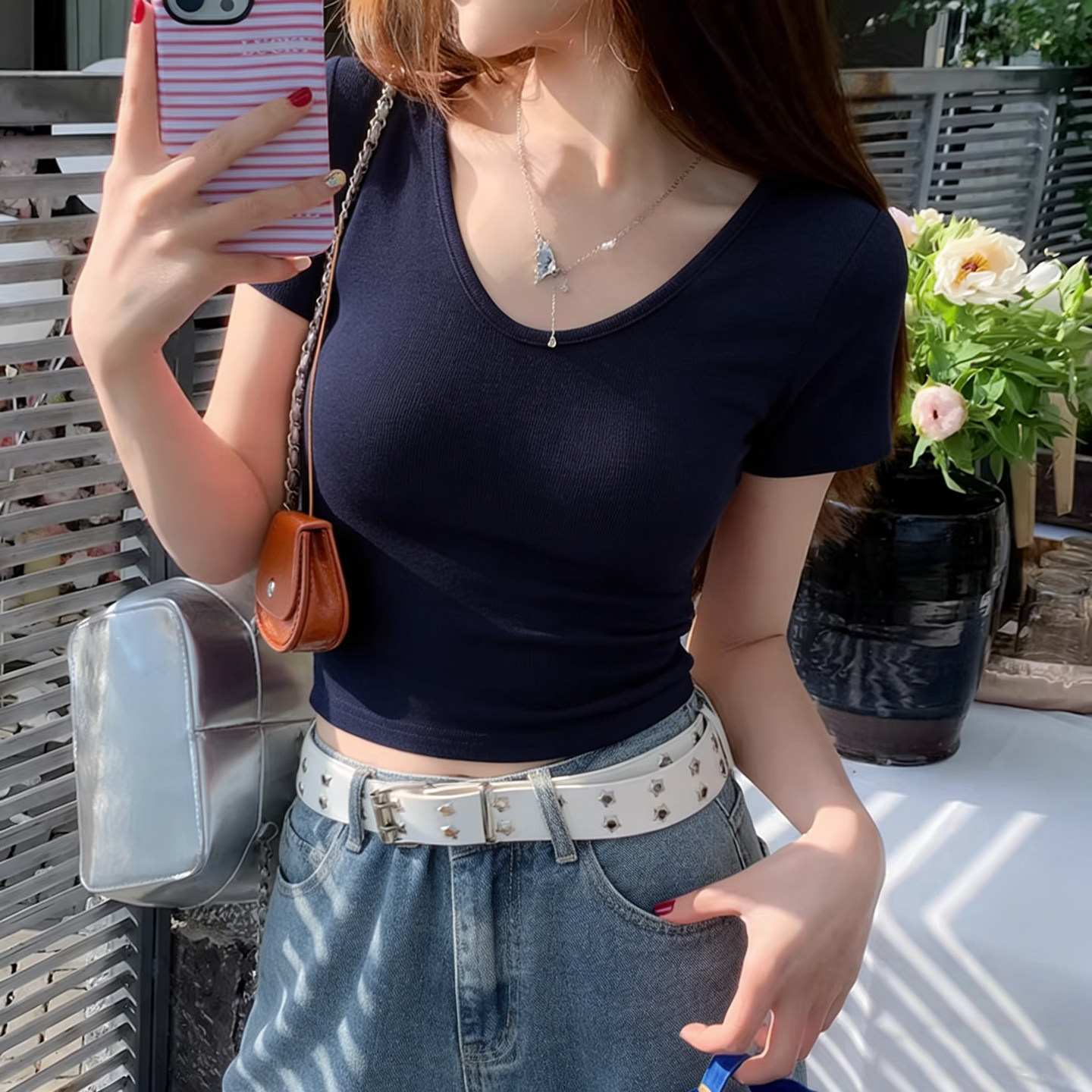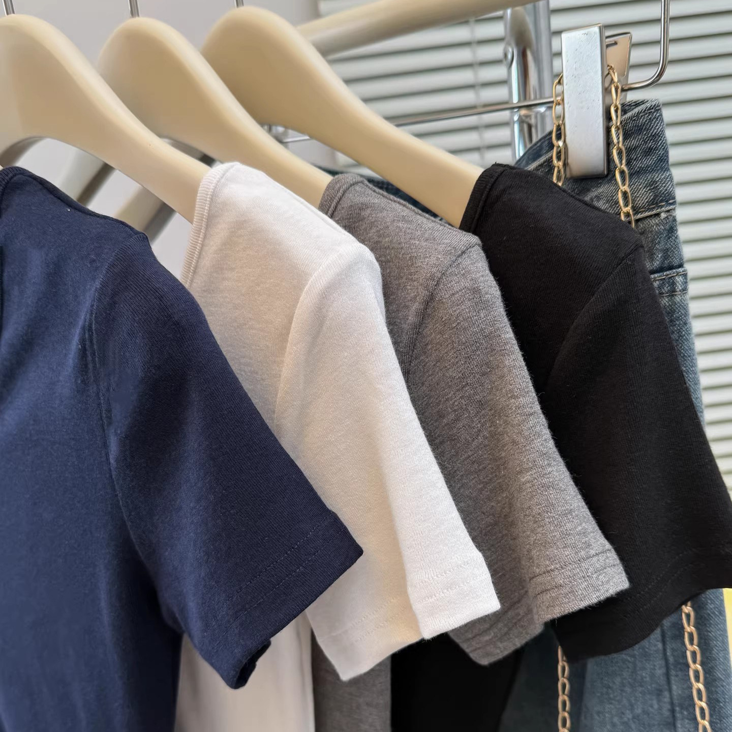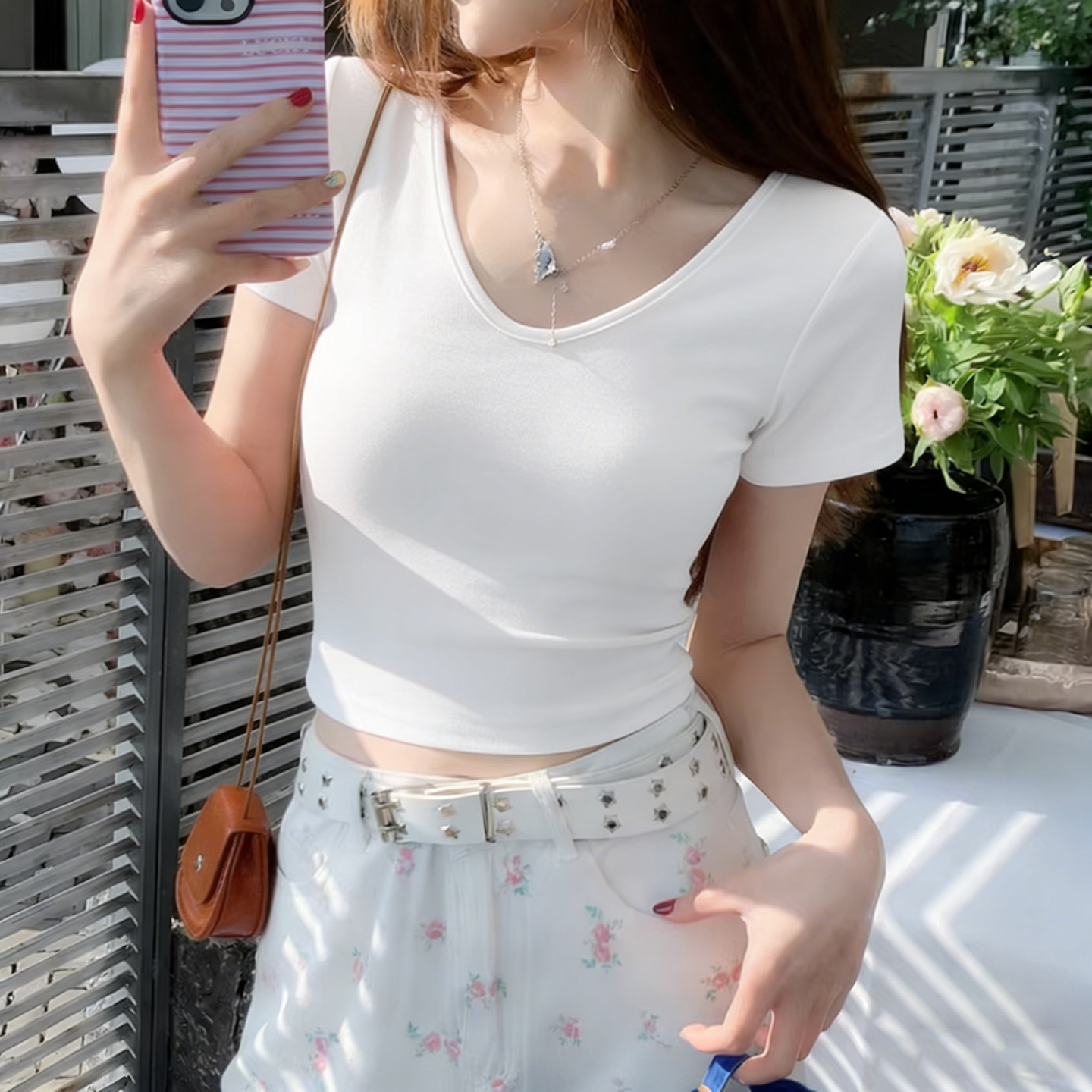 韩版 修身 T恤女夏季 上衣 打底小衫 半袖 内搭短款 纯欲性感V领正肩短袖