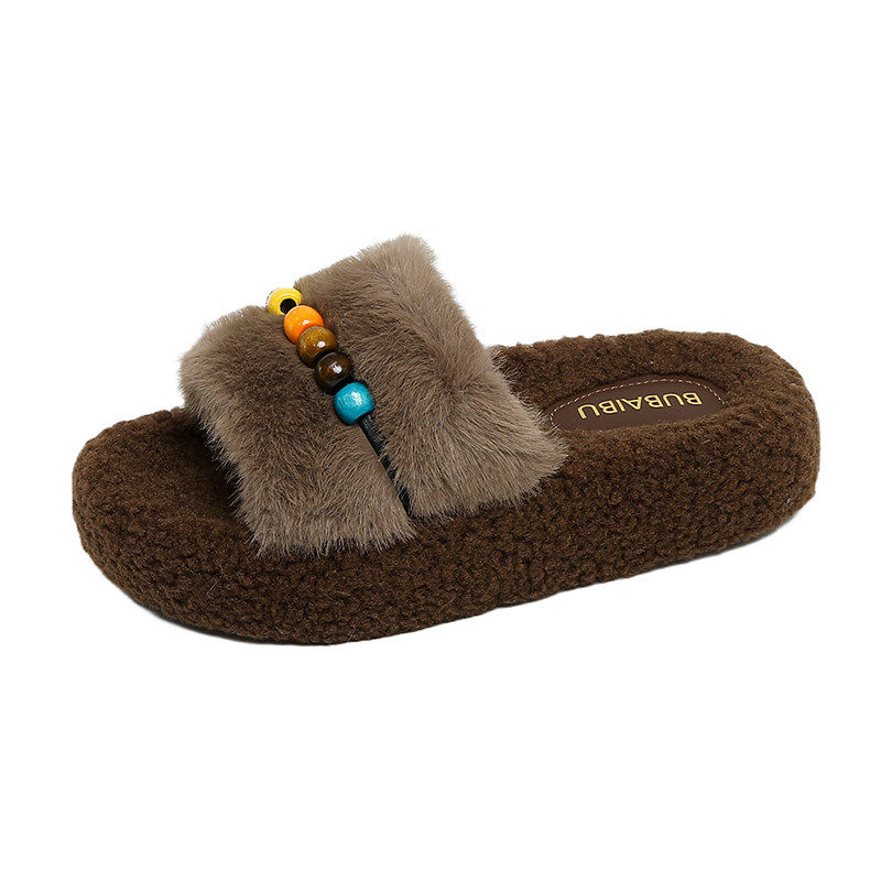 新款 复古串珠时髦百搭一字棉拖 女外穿冬季 潮流高级感欧货毛毛拖鞋由