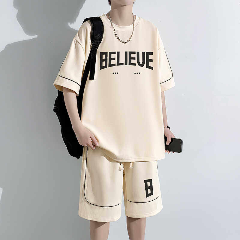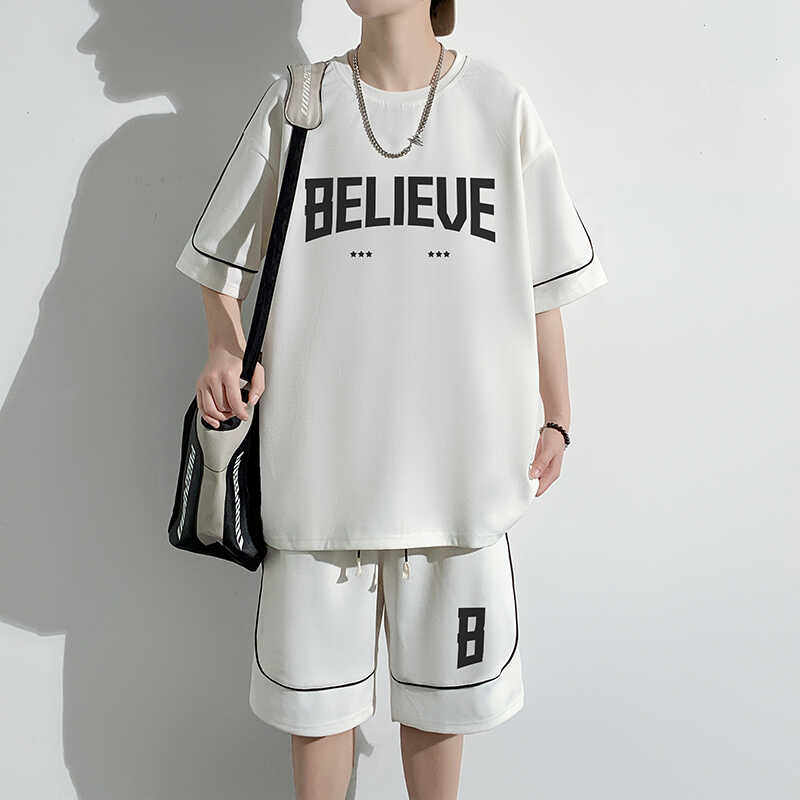 t恤短裤 大码 300斤夏季 港风复古短袖 青少年潮流两件套 休闲运动套装由