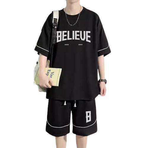t恤短裤 大码 300斤夏季 港风复古短袖 青少年潮流两件套 休闲运动套装
