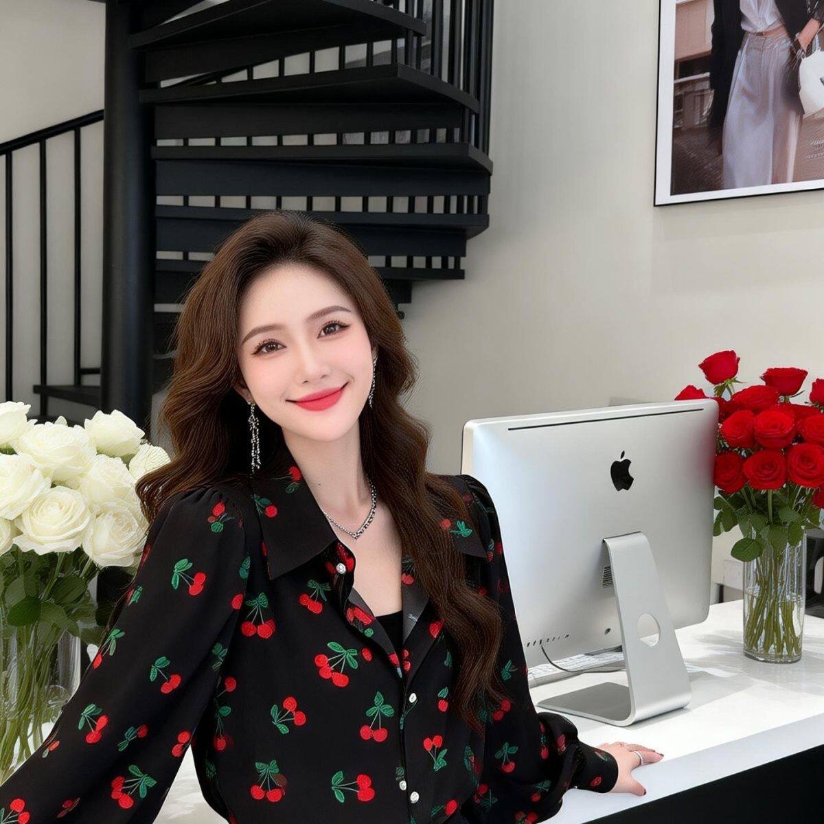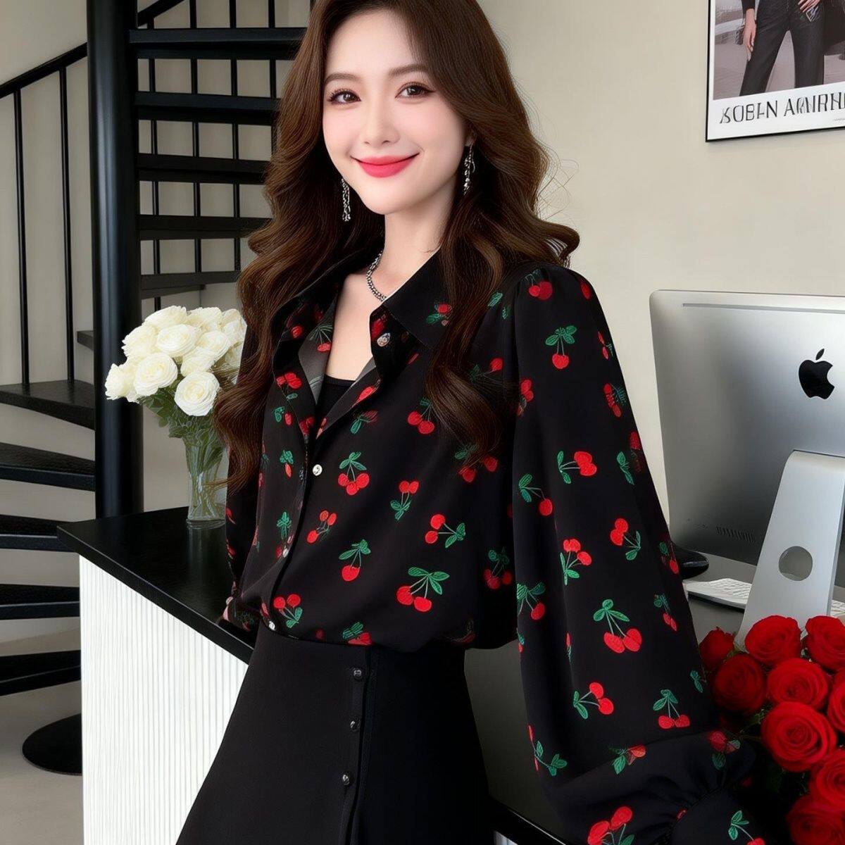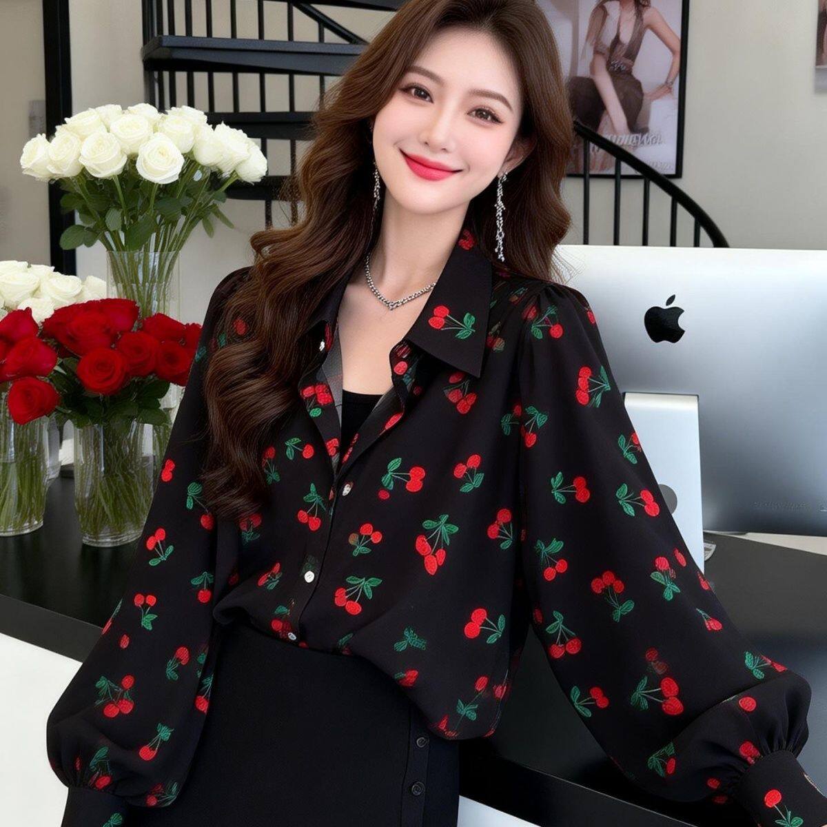 为您提供商品别致小樱桃印花女上衣2026新款 衬衫 时尚 减龄百搭衬衣女 宽松灯笼袖的详细介绍,