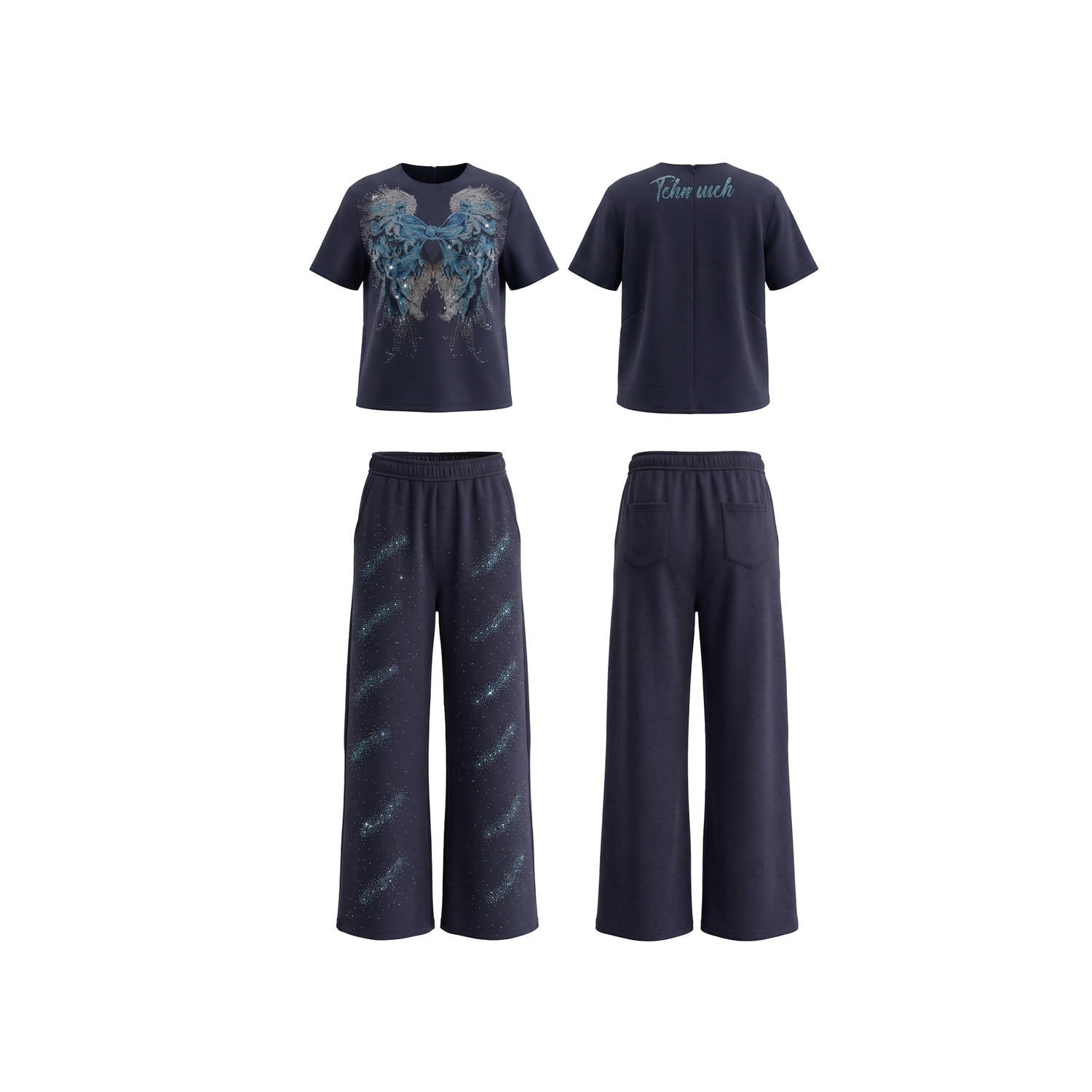 TCH藏青色翅膀烫钻短袖 休闲套装 2026夏新款 T78A07E1171 T恤阔腿裤由