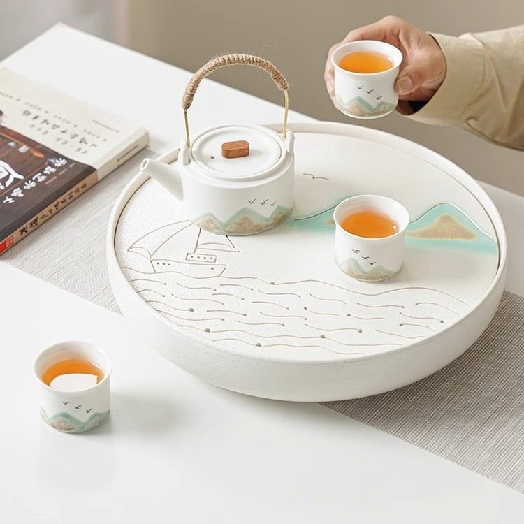 功夫茶盘茶海茶台紫砂大茶盘陶瓷茶具简约家用圆形茶托盘储水小号