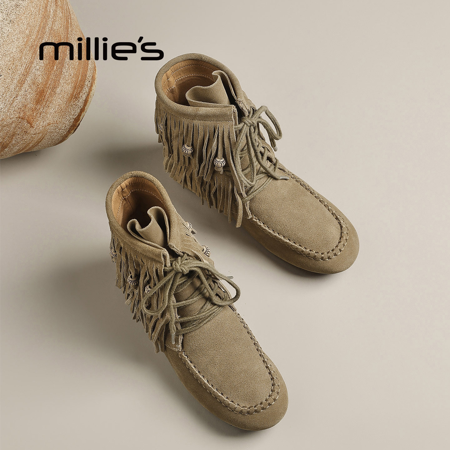 为您提供商品MILLIE 妙丽流苏西部靴女2026新款 冬季 加绒保暖百搭内增高短靴P的详细介绍,